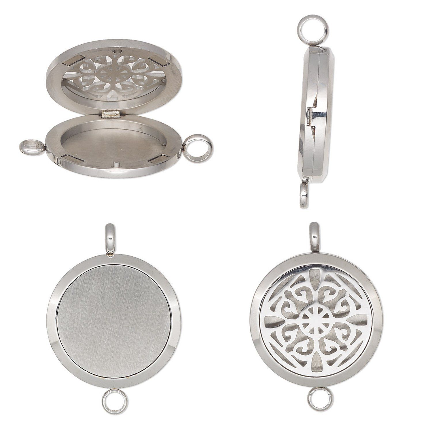 Magnetic closure locket is designed to work with locket inserts. Add drops of essential oils to the inserts for aromatherapy jewelry. Stainless steel locket will not discolor or oxidize, making it ideal for wet, humid, tropical environments and can be easily cleaned for switching inserts. Cutout fancy flower design is perfect for spring and summer. Bail and loop go in different directions. Standard magnetic strength.