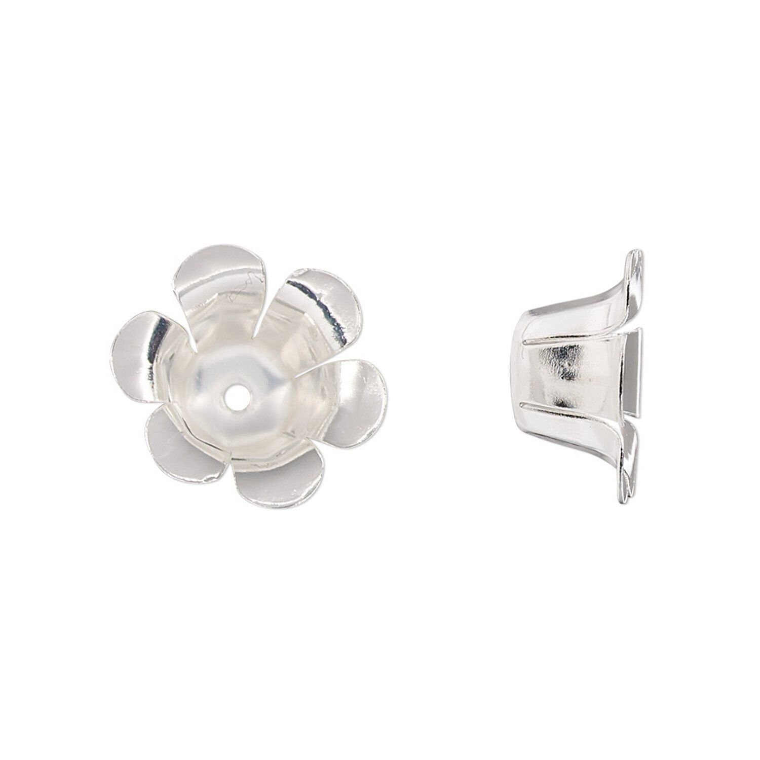 Bead cap, silver-finished steel, 15x7mm flower, fits 8-10mm round bead. Sold per pkg of 20.