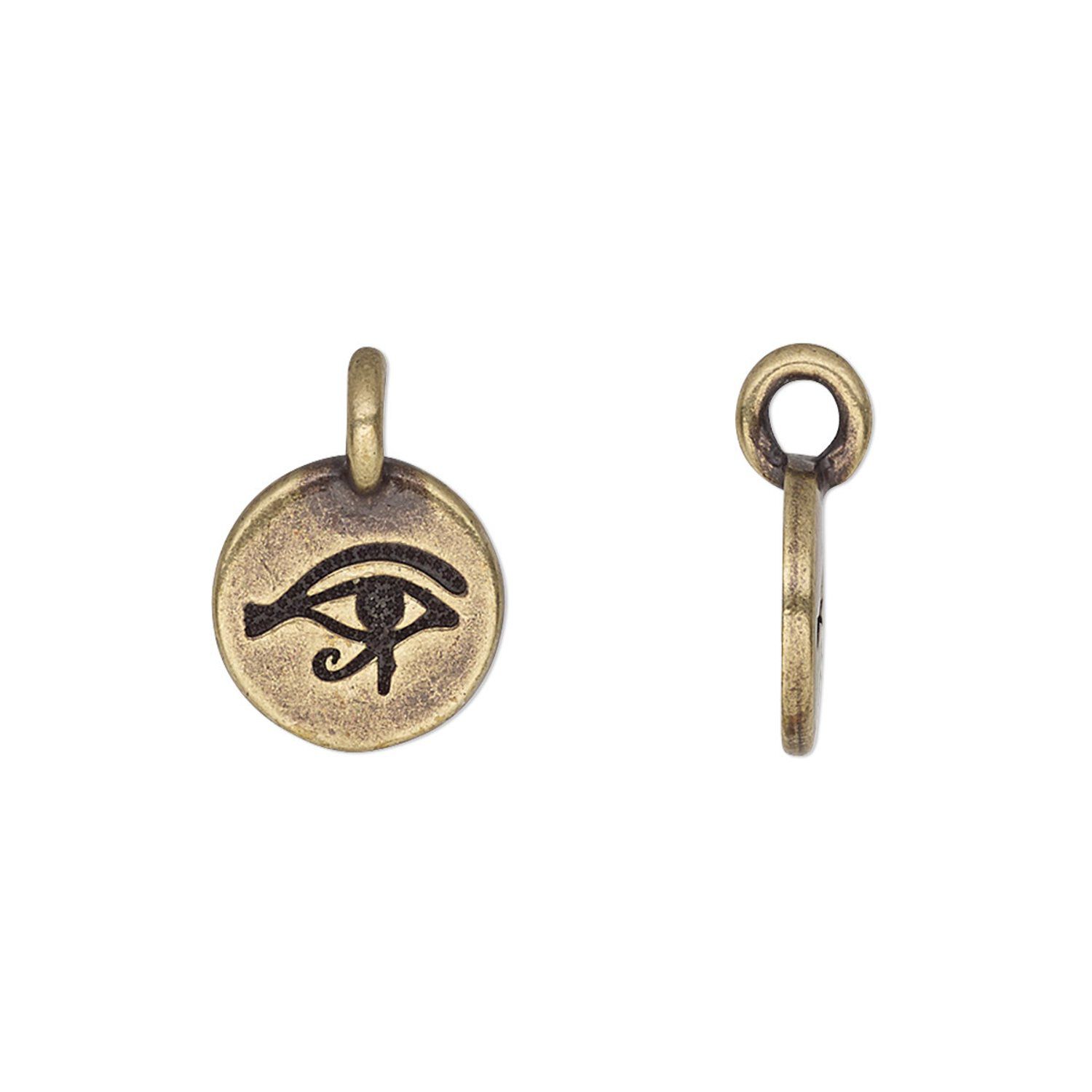 The Eye of Horus is an ancient Egyptian symbol associated with protection, royal power and good health. This petite, antique 12mm round drop is ideal for earrings, charm bracelets and more designs without adding hefty weight.