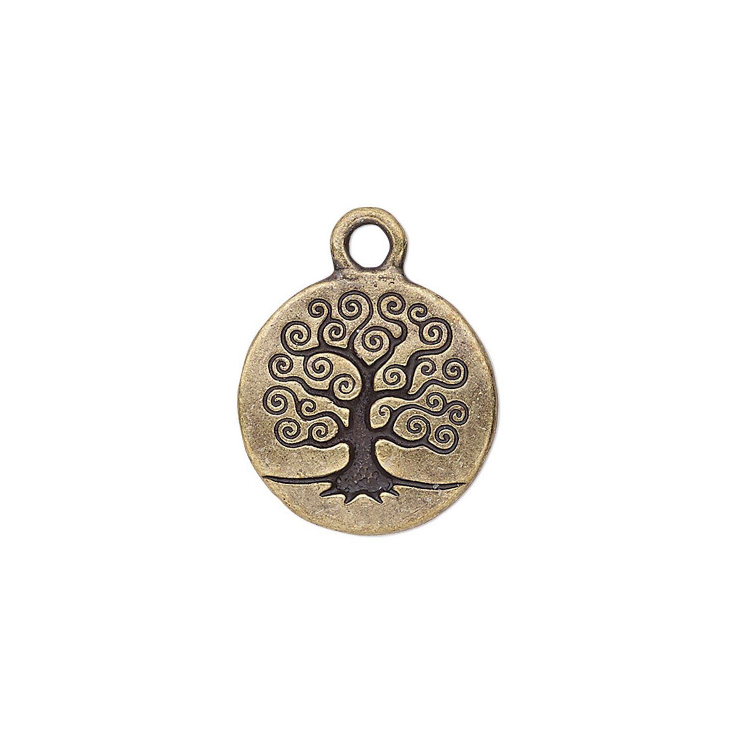 Antique brass-plated flat round drop with tree of life design adds a signature look to jewelry. Loved for their affordability and precious-metal look, pewter (tin-based alloy) drops are lightweight and cost-effective alternatives to precious metal. All original designs, made in Greece and copyrighted by TierraCast®.