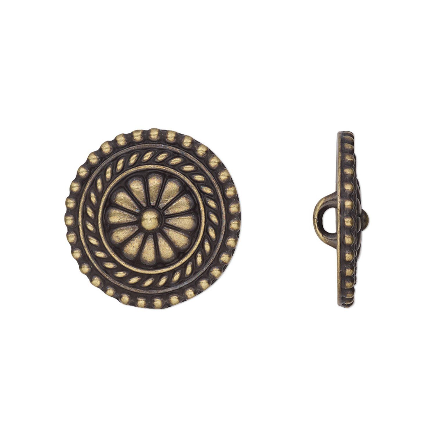 Button, TierraCast®, antique brass-plated pewter (tin-based alloy), 18mm beaded flat round with flower and loop. Sold per pkg of 20.