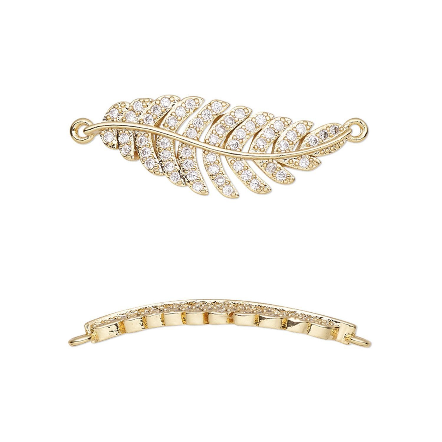 Gold-finished brass feather link encrusted in cubic zirconia for a glittering pavé design. Golden link brings an upscale, designer-quality look with its beauty.
