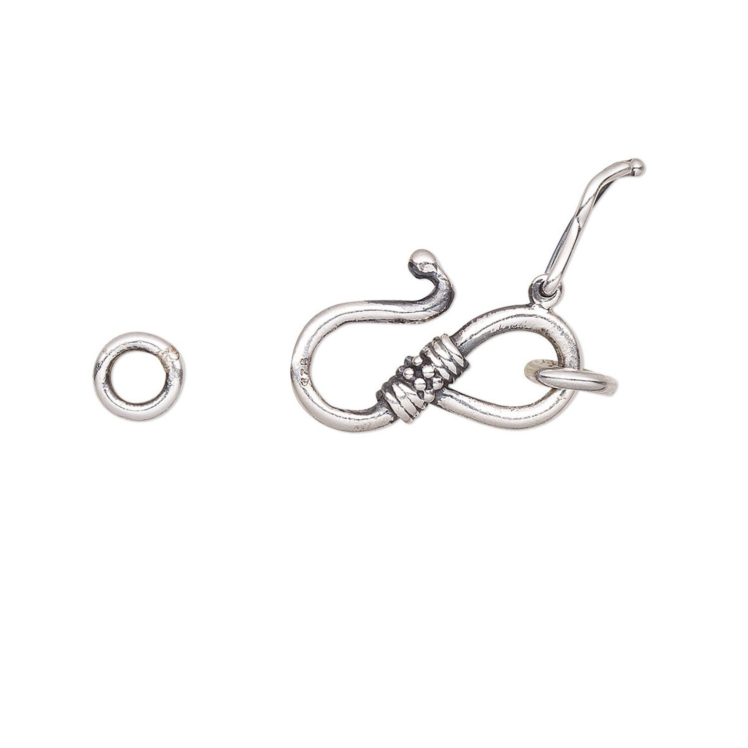 This antiqued sterling silver S-hook clasp features a 4.5mm closed jump ring either end, perfect for attaching beaded strands or chains. This clasp has an easy-to-use safety catch, to ensure that necklaces and bracelets remain closed. Clasp features a rope and line design. Sizes, shapes and colors may vary with handcrafted items. Clasp has an anti-tarnish coating.