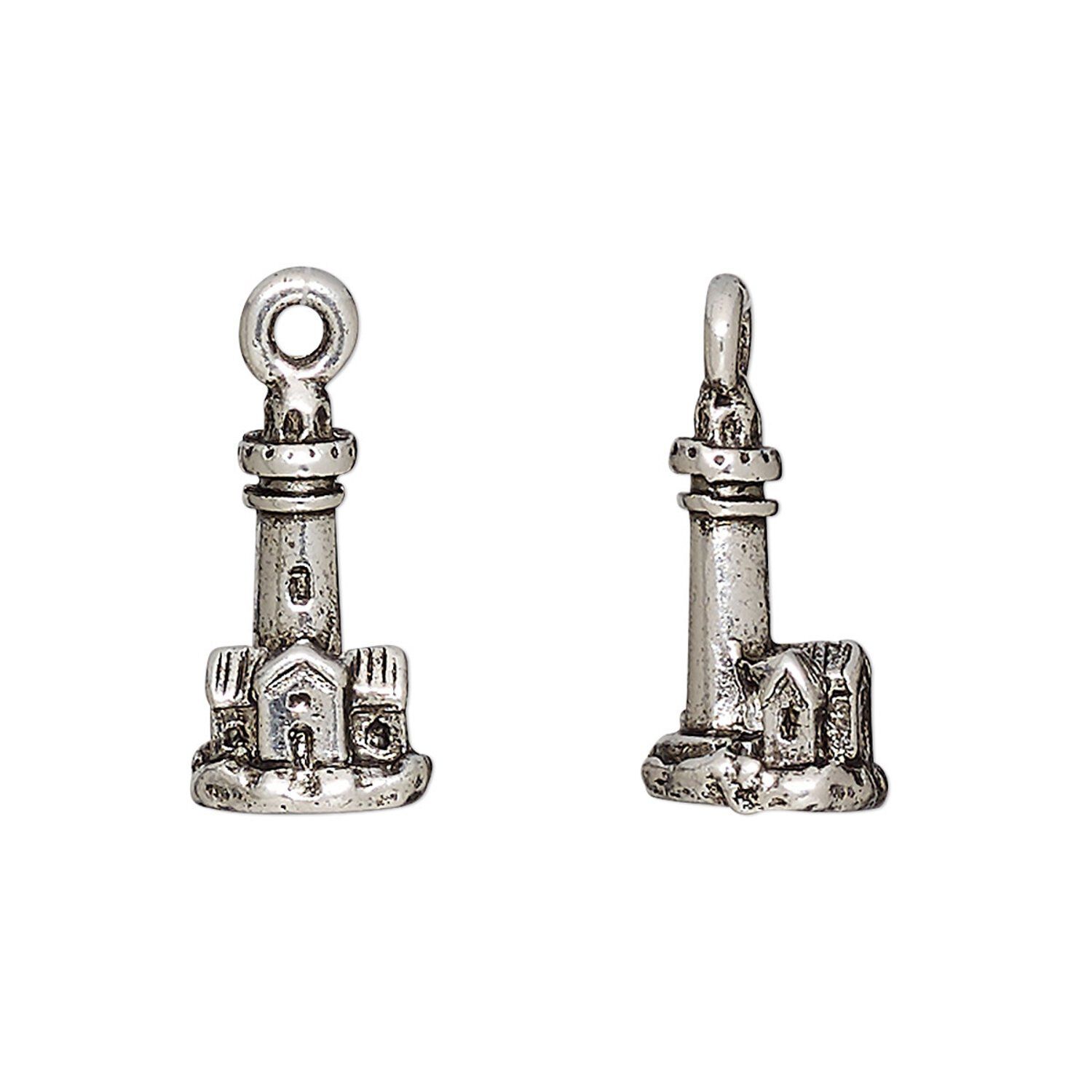 Charm, antique silver-plated pewter (tin-based alloy), 16.5x10mm 3D lighthouse. Sold per pkg of 2.