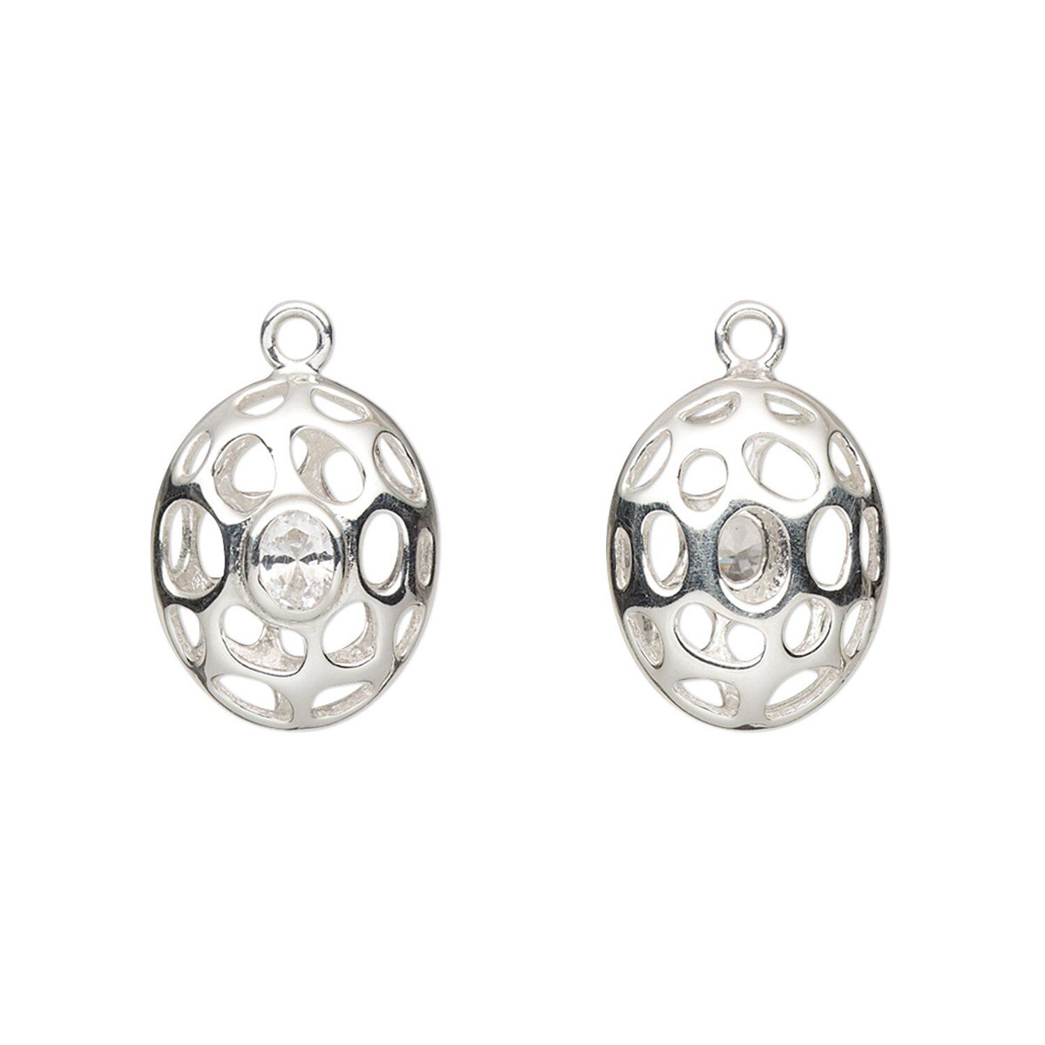 This sterling silver oval drop is hollow on the interior, with a single cubic zirconia in one of the many openings that allow light and air to pass through. Drop has an anti-tarnish coating.