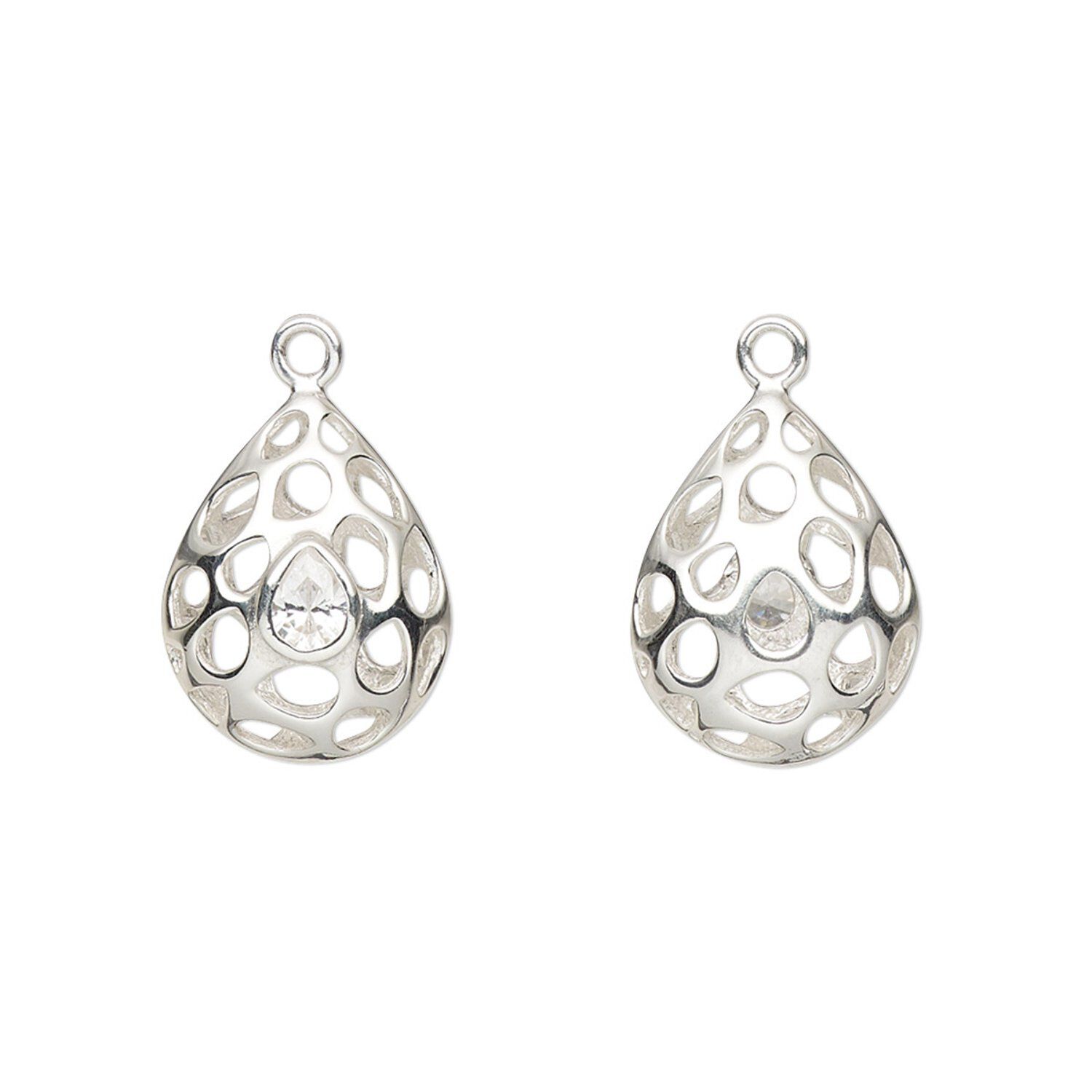 This sterling silver teardrop is hollow on the interior, with a single cubic zirconia in one of the many openings that allow light and air to pass through. Drop has an anti-tarnish coating.