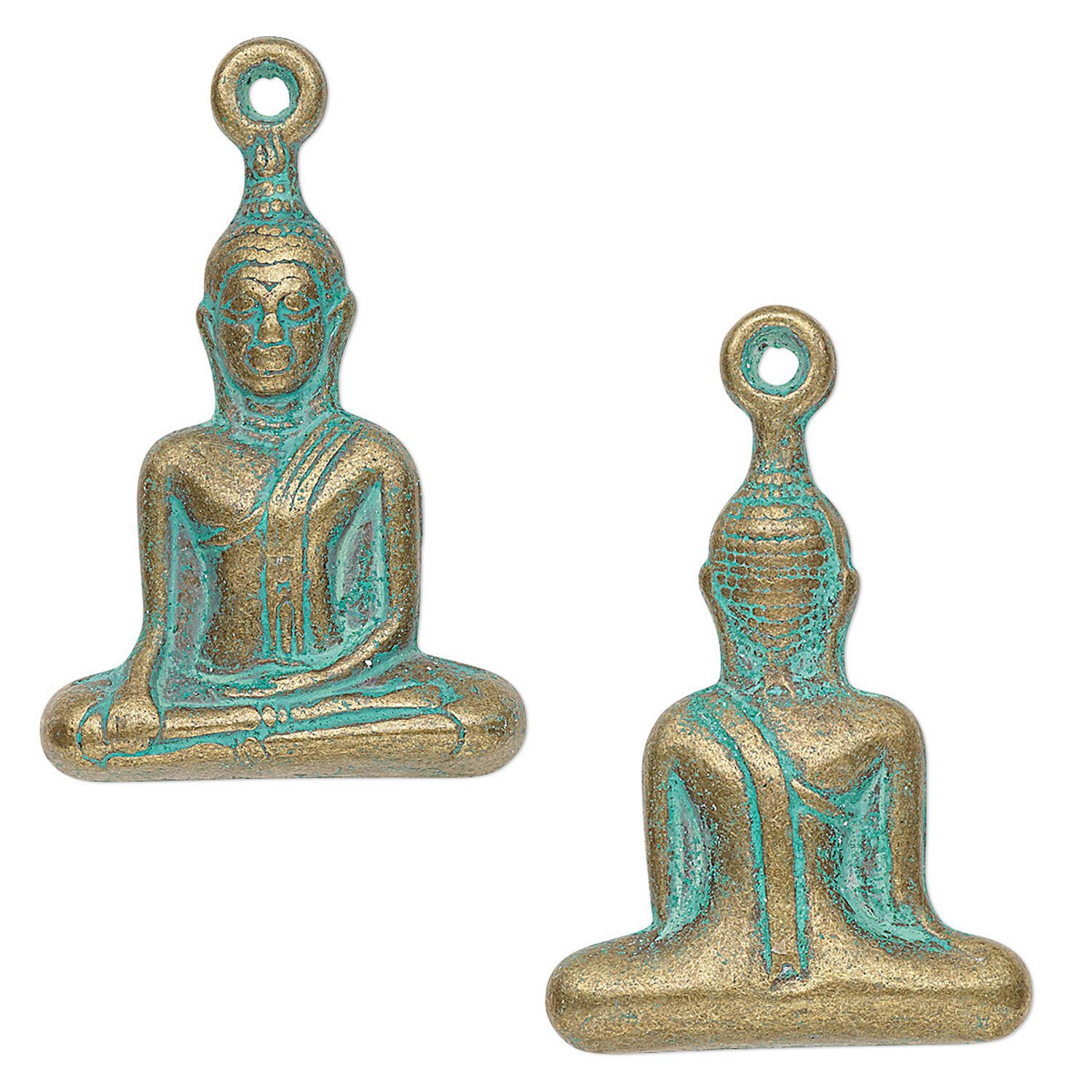 Focal, antique brass-plated "pewter" (zinc-based alloy), green patina, 30x23mm 3D Buddha. Sold per pkg of 2.