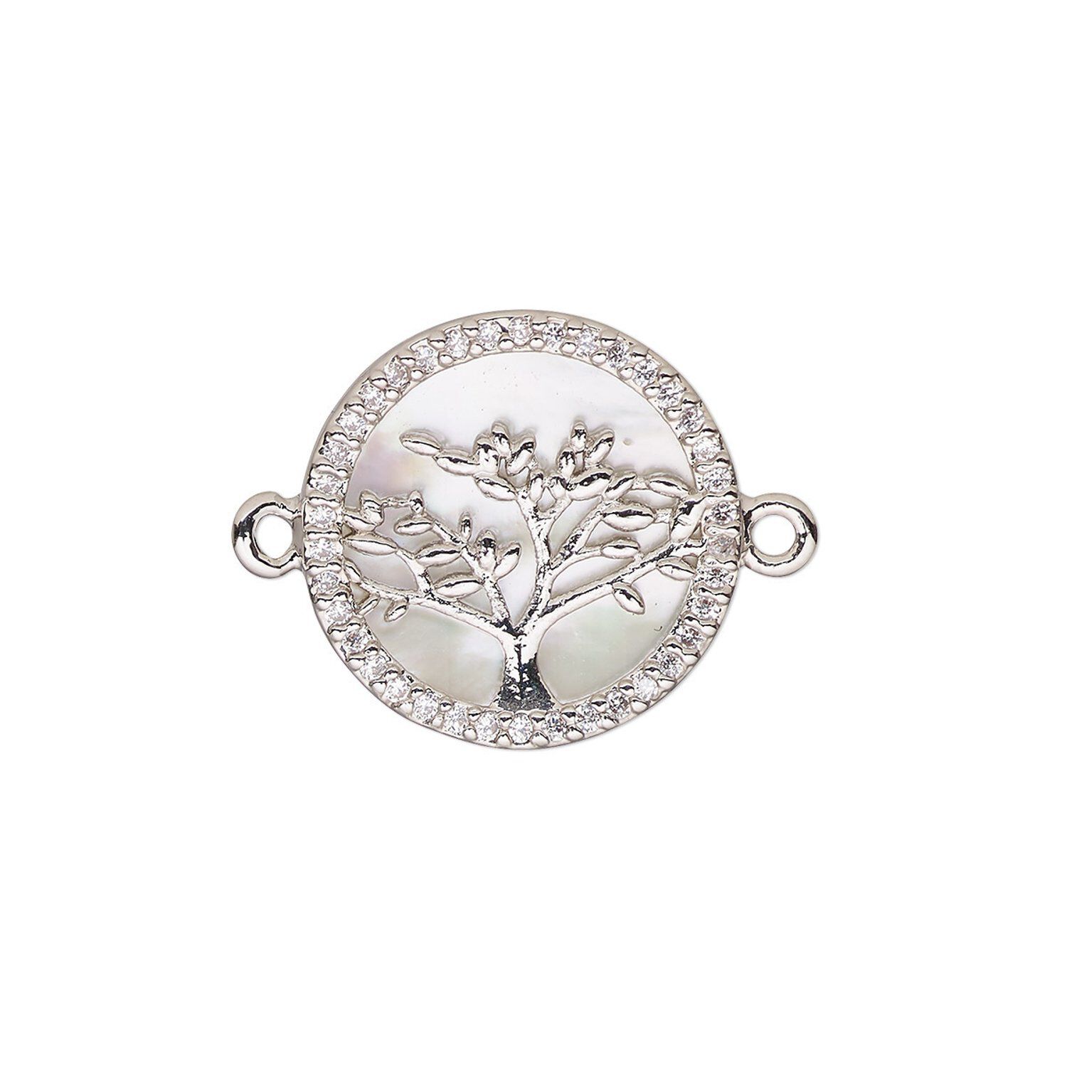Link, mother-of-pearl shell (bleached) / cubic zirconia / silver-finished brass, clear and white, 15mm single-sided round with tree of life design. Sold individually.