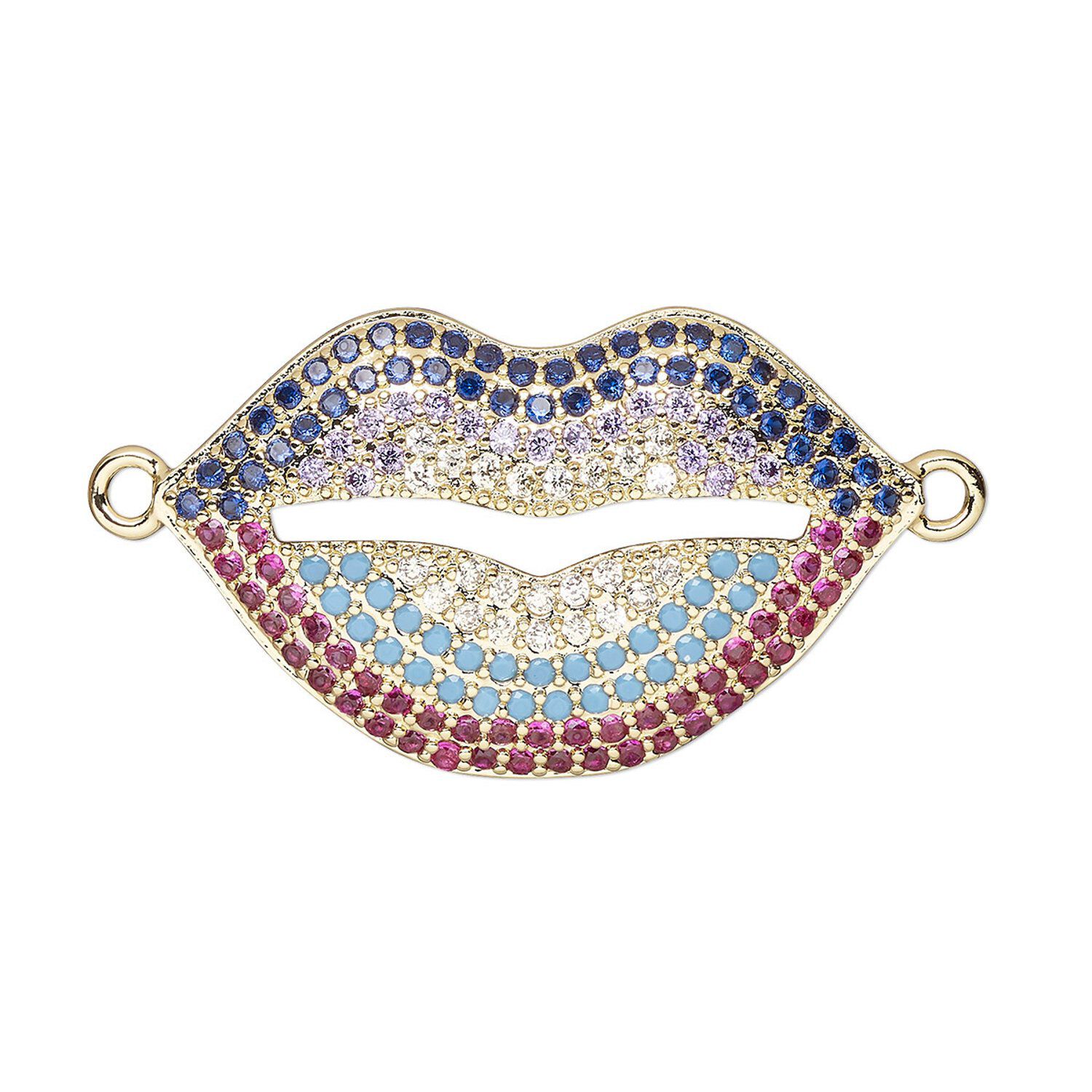 Micro pavé lips add glittering glamour to jewelry designs with machine-set cubic zirconia for high perceived value. Electro-coated gold-finish adds a sleek stylish look to the design. Colors can include pink, dark blue, purple and more.