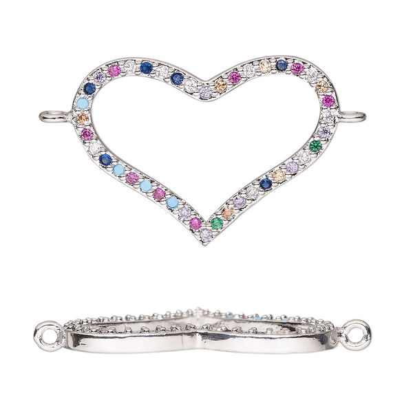 Link, cubic zirconia and silver-finished brass, multicolored, 24.5x18mm single-sided open heart. Sold individually.