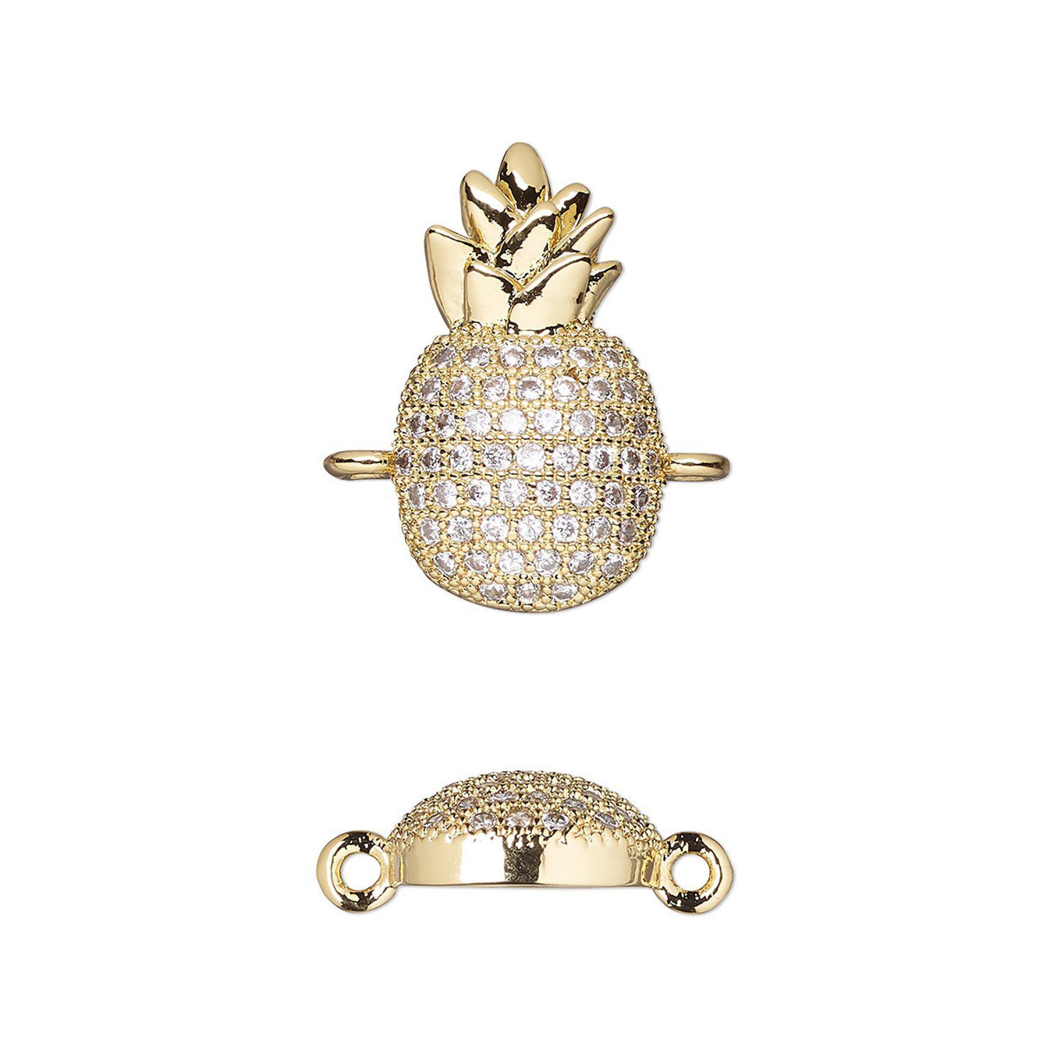 Link, cubic zirconia and gold-finished brass, clear, 16.5x9mm single-sided pineapple. Sold individually.