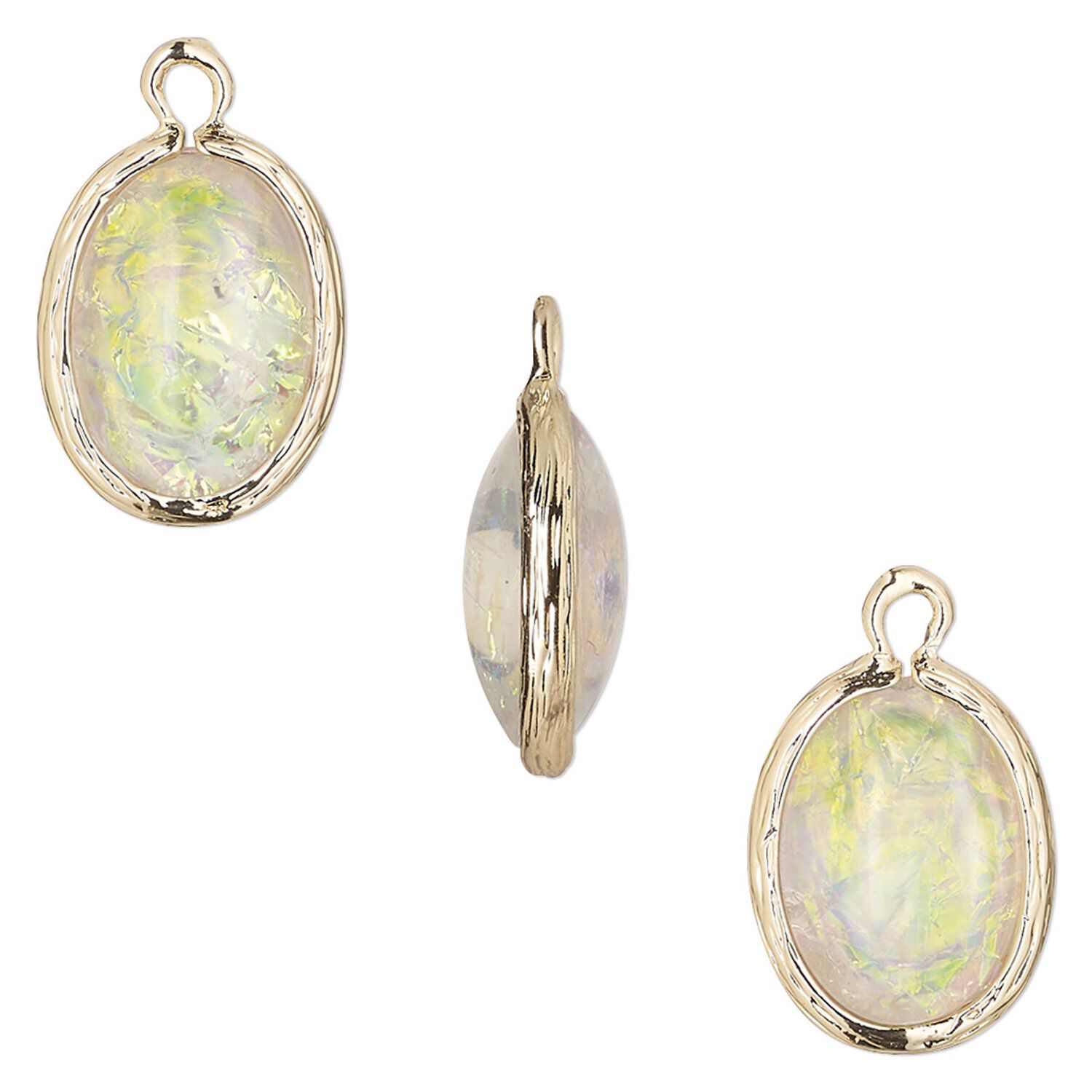Trendy imitation "opal" exudes an iridescent shimmer. Lightweight components are double-sided for twice the shine. Framed with finished brass, these are economical choices for fun and flashy jewelry.