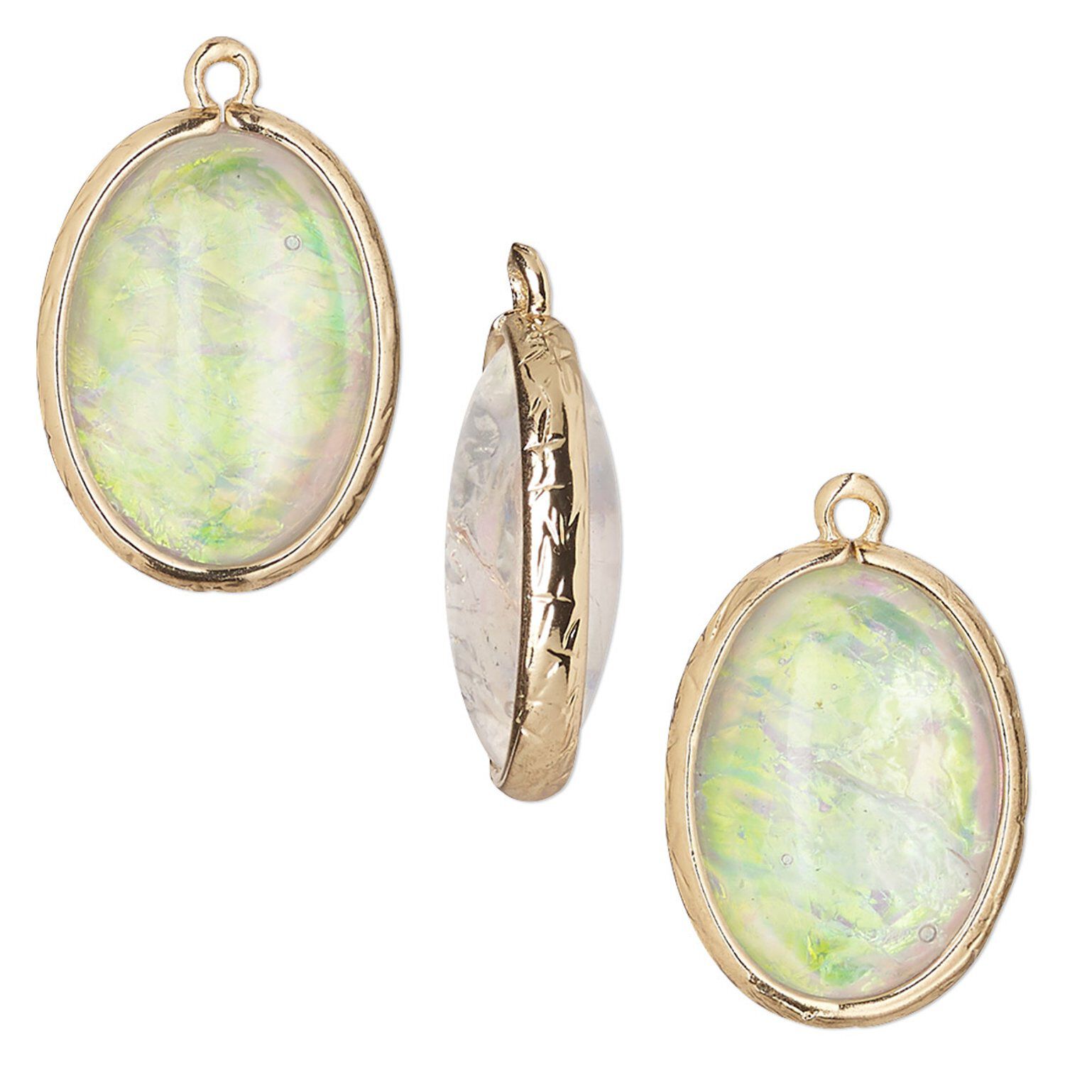 Trendy imitation "opal" exudes an iridescent shimmer. Lightweight components are double-sided for twice the shine. Framed with finished brass, these are economical choices for fun and flashy jewelry.