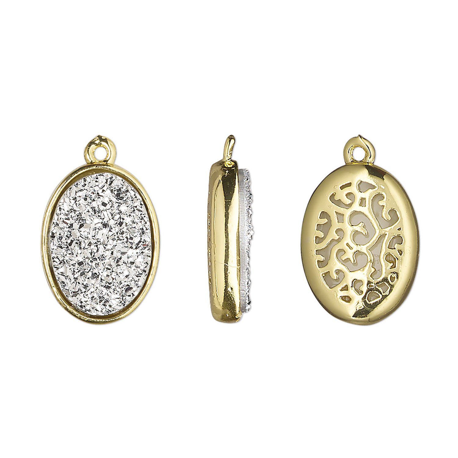 Drop, Druzylite™, "druzy" (resin) and gold-finished brass, silver, 15.5x11.5mm two-sided oval with open filigree back. Sold per pkg of 4.