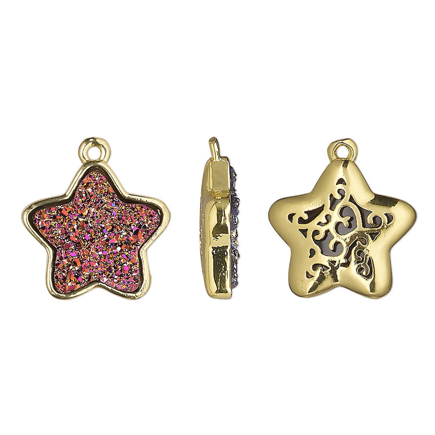 Drop, Druzylite™, "druzy" (resin) and gold-finished brass, metallic purple, 15x14mm two-sided star with open filigree back. Sold per pkg of 4.