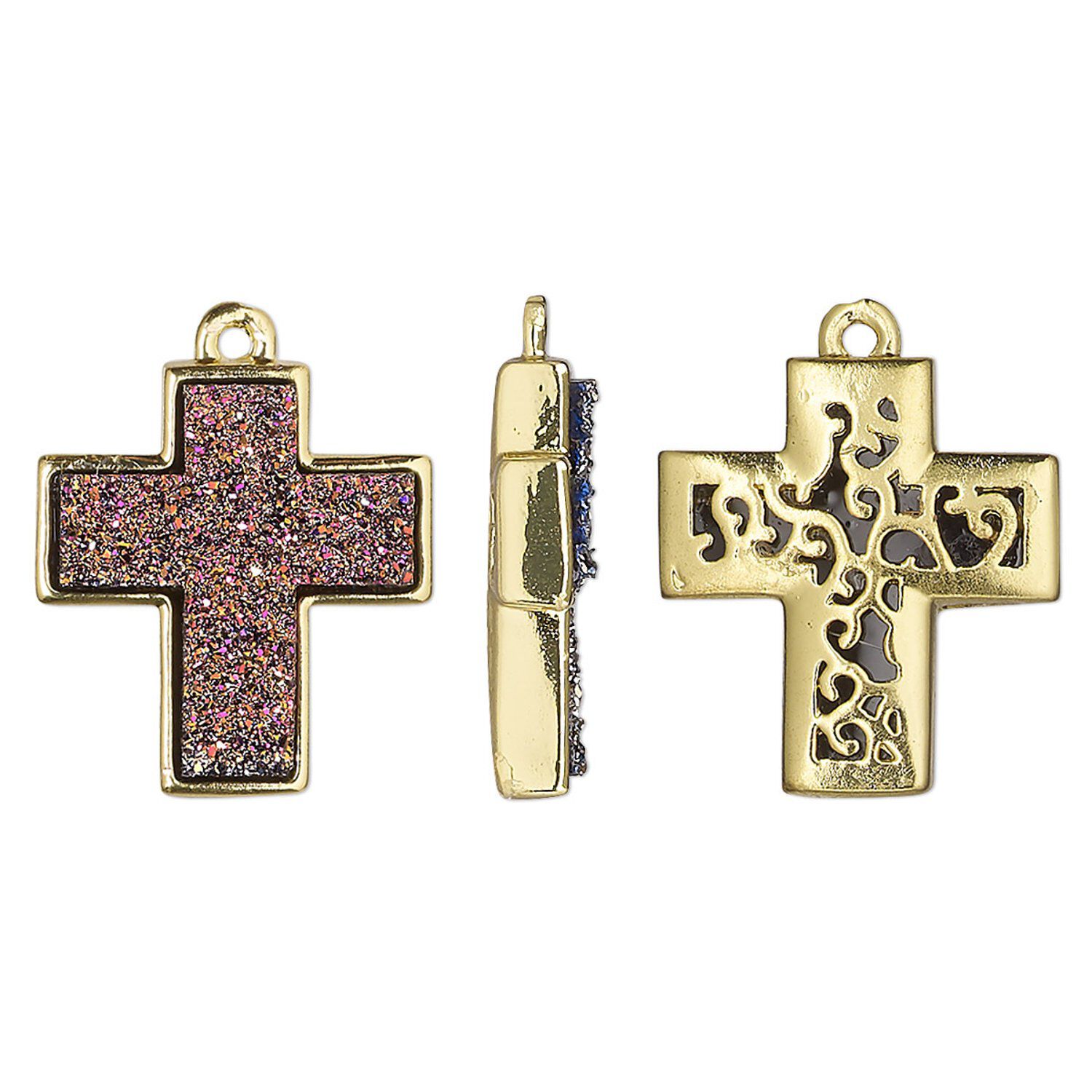 Drop, Druzylite™, "druzy" (resin) and gold-finished brass, metallic purple, 18x16mm two-sided cross with open filigree back. Sold per pkg of 4.