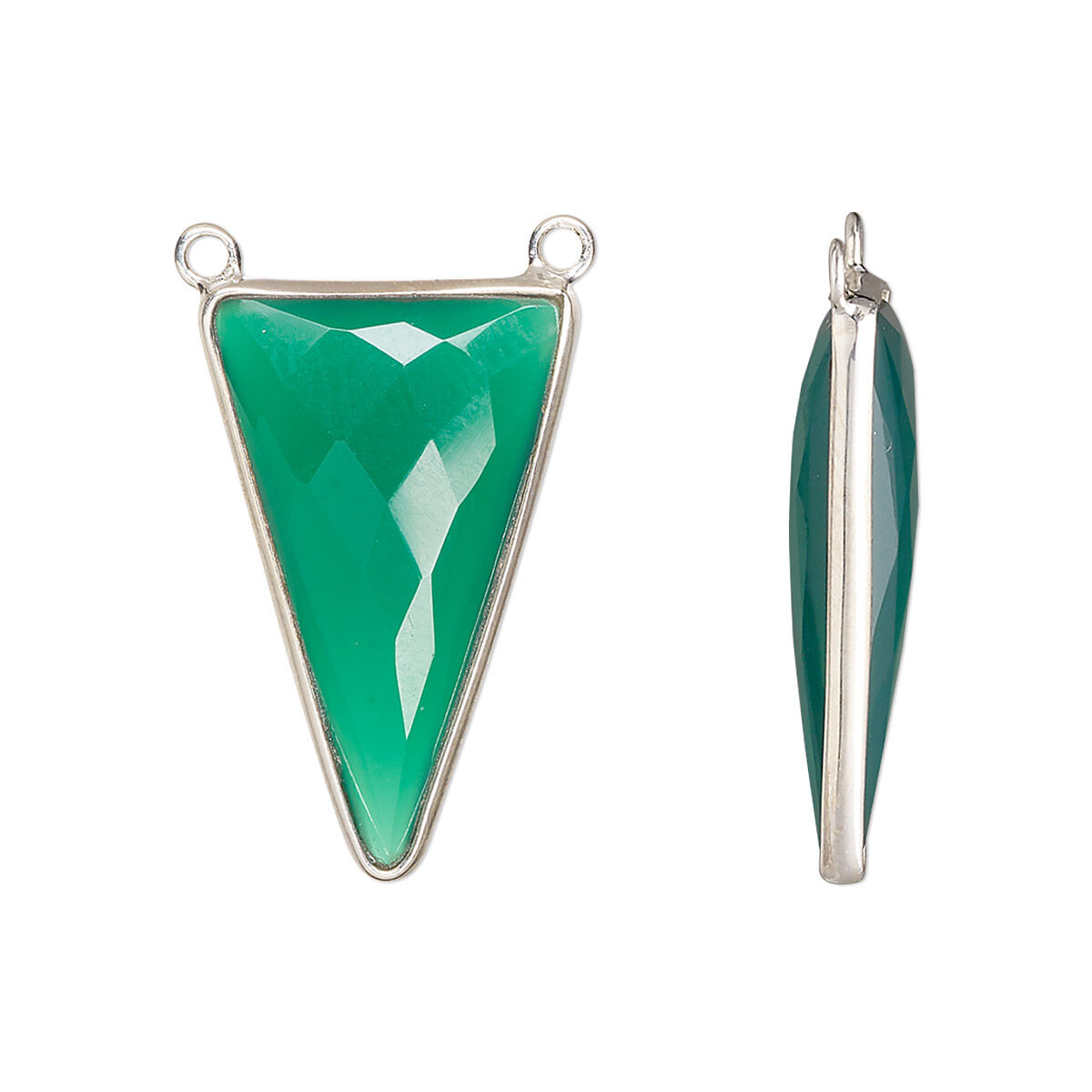 Connector, sterling silver and green onyx (dyed), 25x15mm hand-cut double-sided faceted triangle with 2 closed loops, Mohs hardness 6-1/2 to 7. Sold individually.