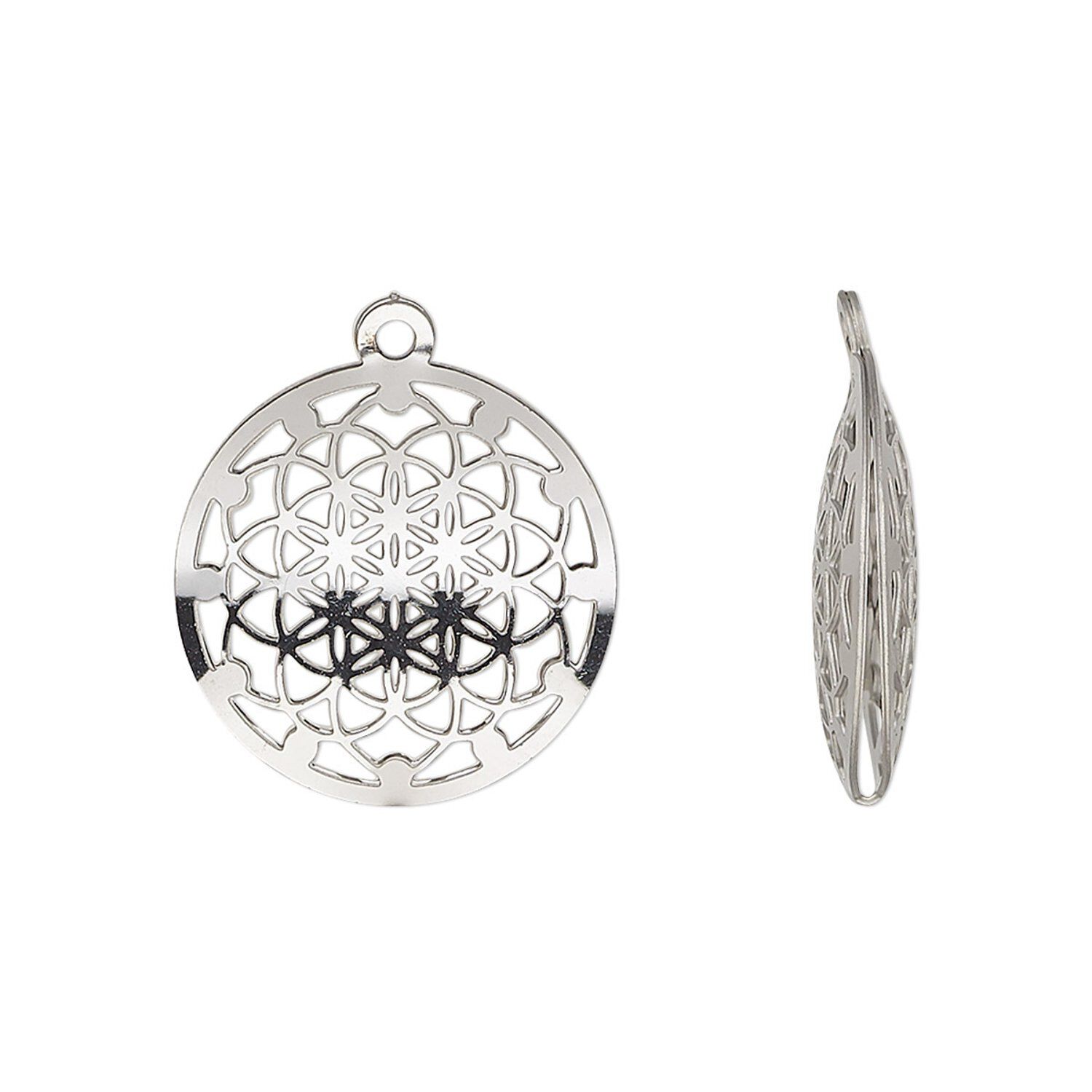 Make a statement with double-sided stainless steel drops that have a cutout kaleidoscope design. They're lightweight, sturdy, and have the metallic gleam that will make them stand out when used with earrings, bracelets and necklaces. Interior has a hollow space, to create a 3-dimensional drop.
