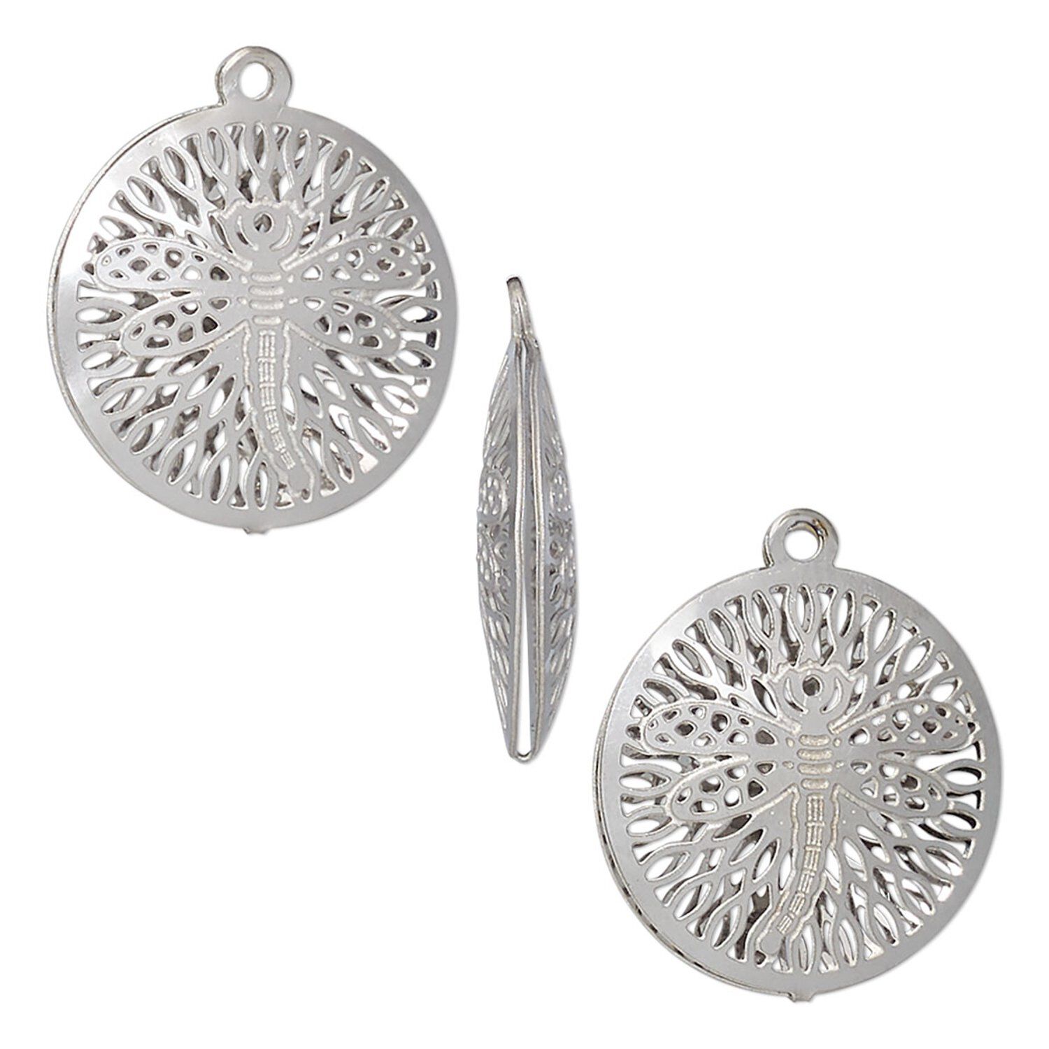Drop, stainless steel, 18mm double-sided domed round with textured cut-out dragonfly design. Sold per pkg of 6.