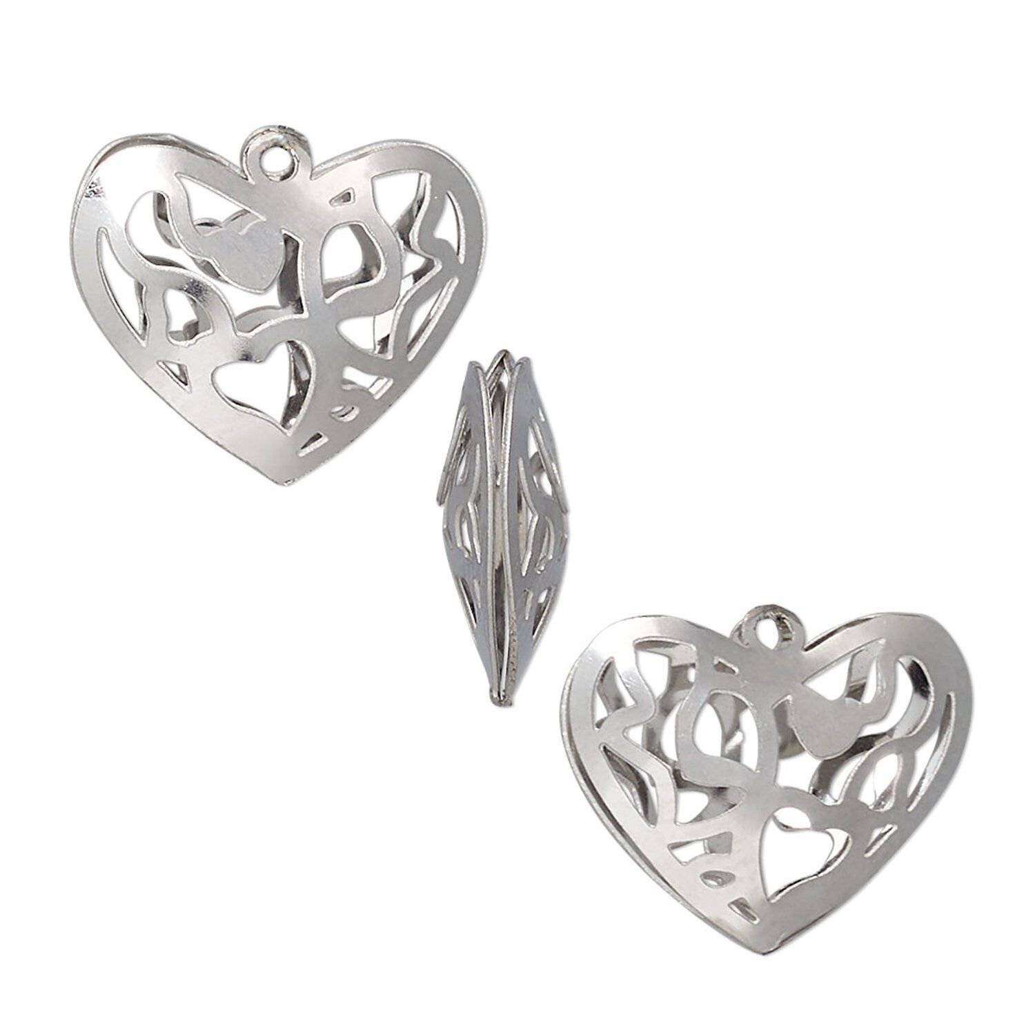 Make a statement with a heart double-sided stainless steel drop that has been cut-out in a multi-heart design. They're lightweight, sturdy, and have the metallic gleam that will make them stand out when used with earrings, bracelets and necklaces. Interior has a hollow space, to create a 3-dimensional drop.