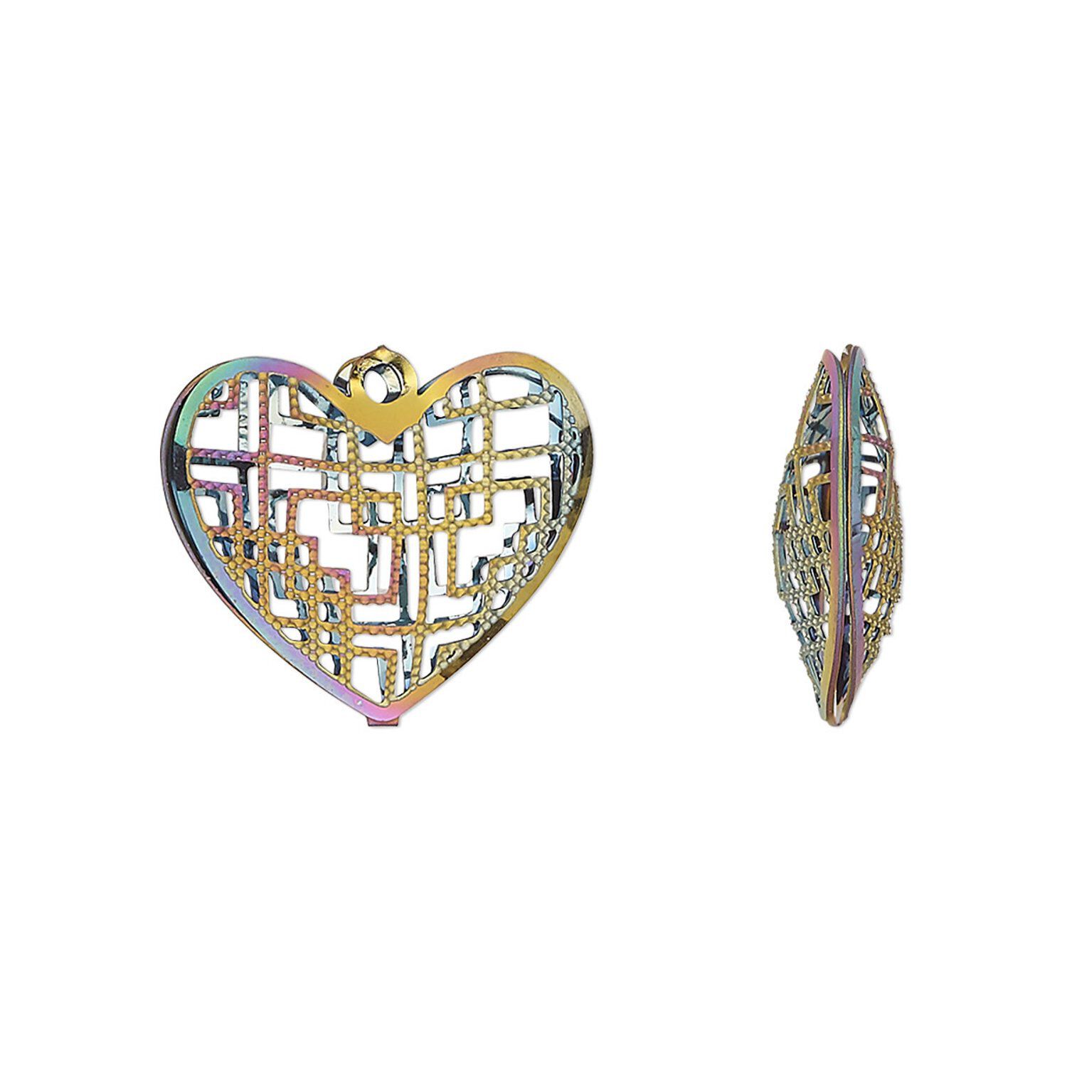 Make a statement with a heart double-sided, electro-coated rainbow stainless steel drop that has been cut-out in a geometric design. They're lightweight, sturdy, and have the metallic gleam that will make them stand out when used with earrings, bracelets and necklaces. Interior has a hollow space, to create a 3-dimensional drop.