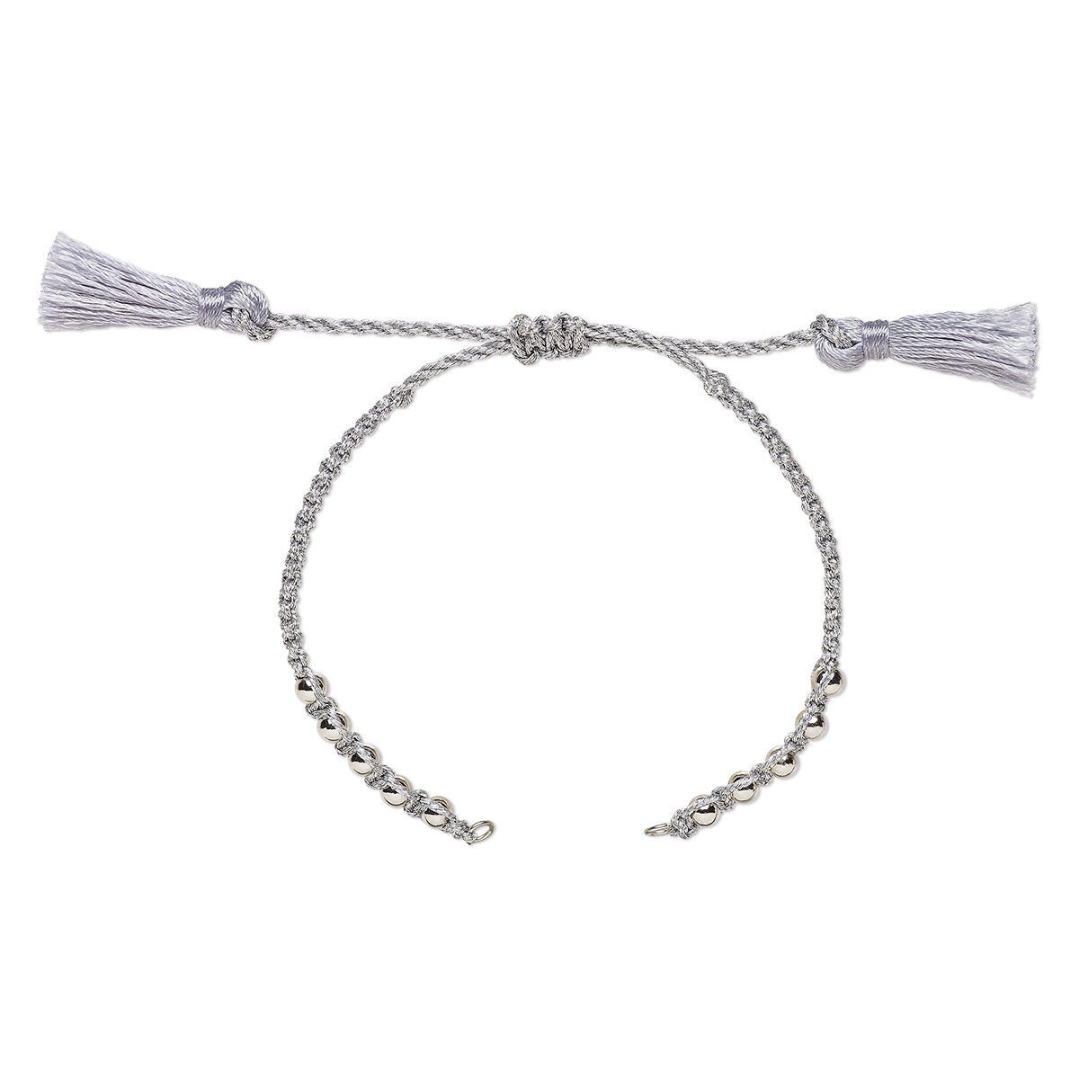 Bracelet component, nylon and silver-finished brass, silver, 9-3/4 inches with adjustable macramé closure and (2) 5mm open loops. Sold individually.