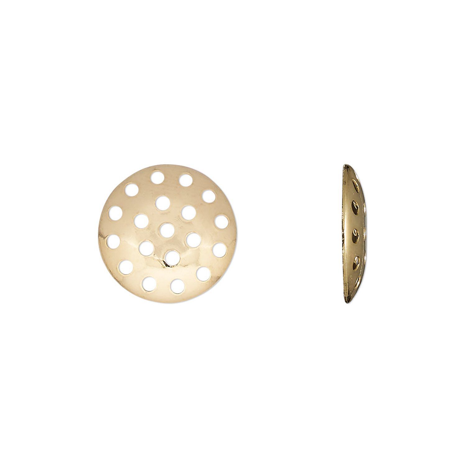The brass based perforated disc component is perfect for attaching to a variety of jewelry findings, such as brooches, clip-on earrings and ear studs. The small perforated holes make for easy wiring or sewing of gemstones, gemstone chips and more. The metallic finish of the component adds a subtle luster for a polished look. Discs are machine-made for consistent size, shape and finish.
