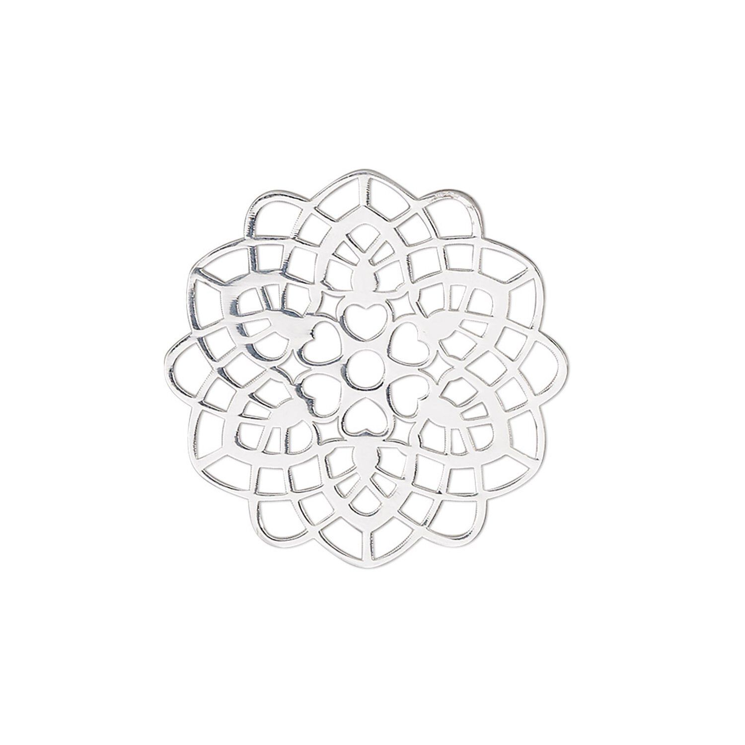 Well-polished, intricately detailed sterling silver component is lightweight and ideal for earrings, just add an ear wire. The pleasing round shape and cutout hearts and flower design makes it a good choice for bridal, Mother's and Valentine's Day jewelry. Drop has an anti-tarnish coating.
