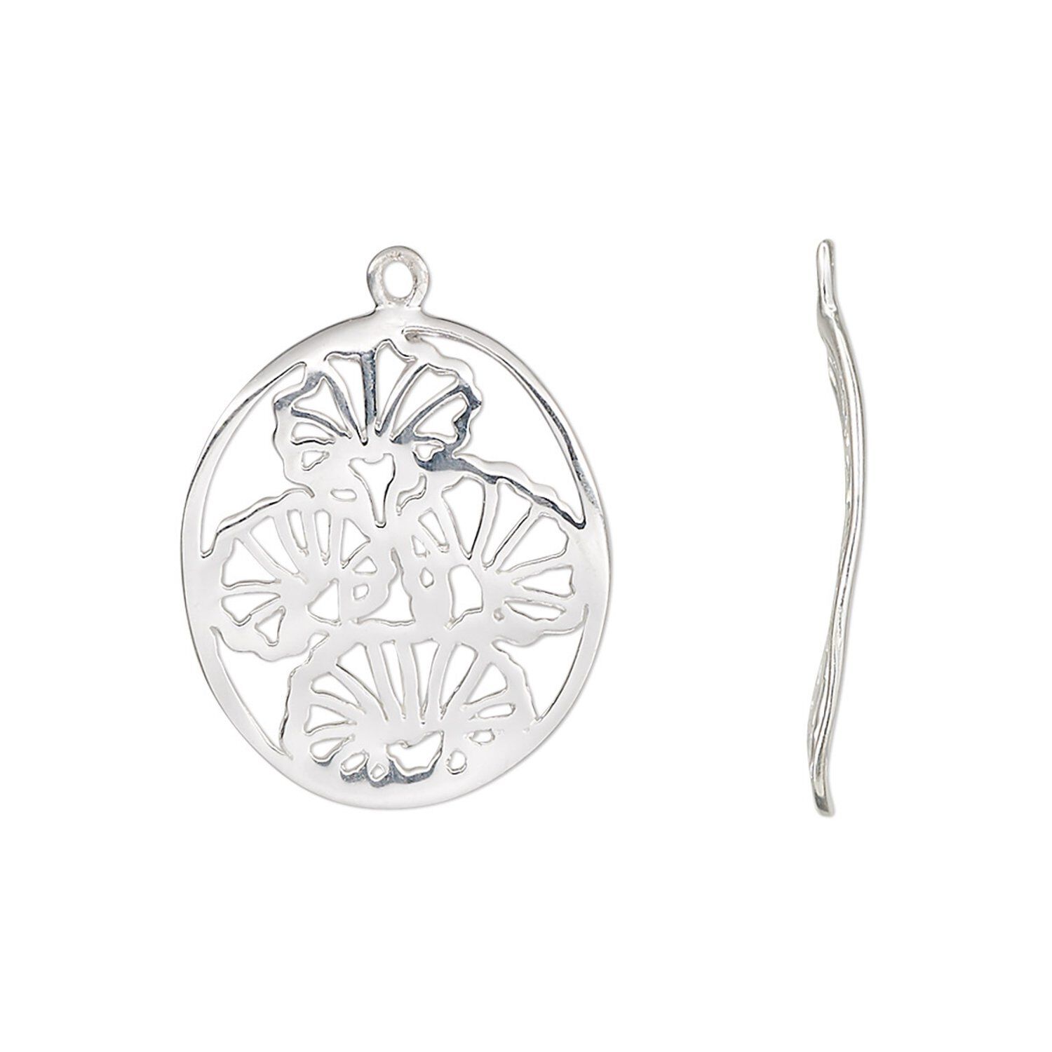Drop, sterling silver, 21x18mm single-sided wavy oval with cutout ginkgo leaves. Sold individually.