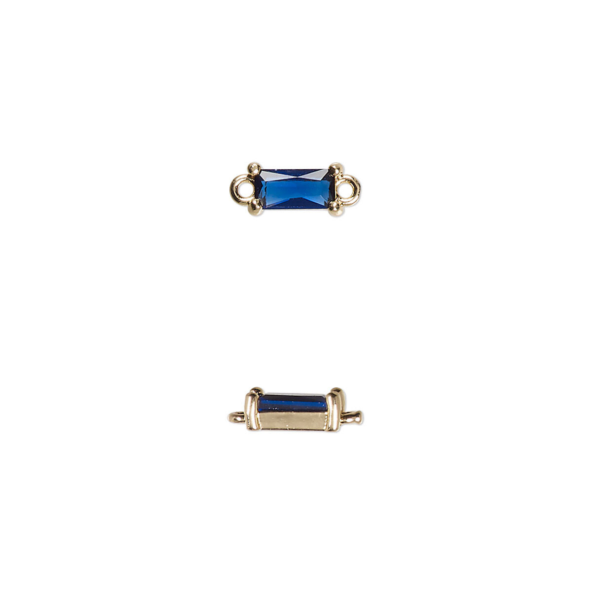 Link, glass and gold-finished brass, dark blue, 7.5x4mm faceted rectangle. Sold per pkg of 10.