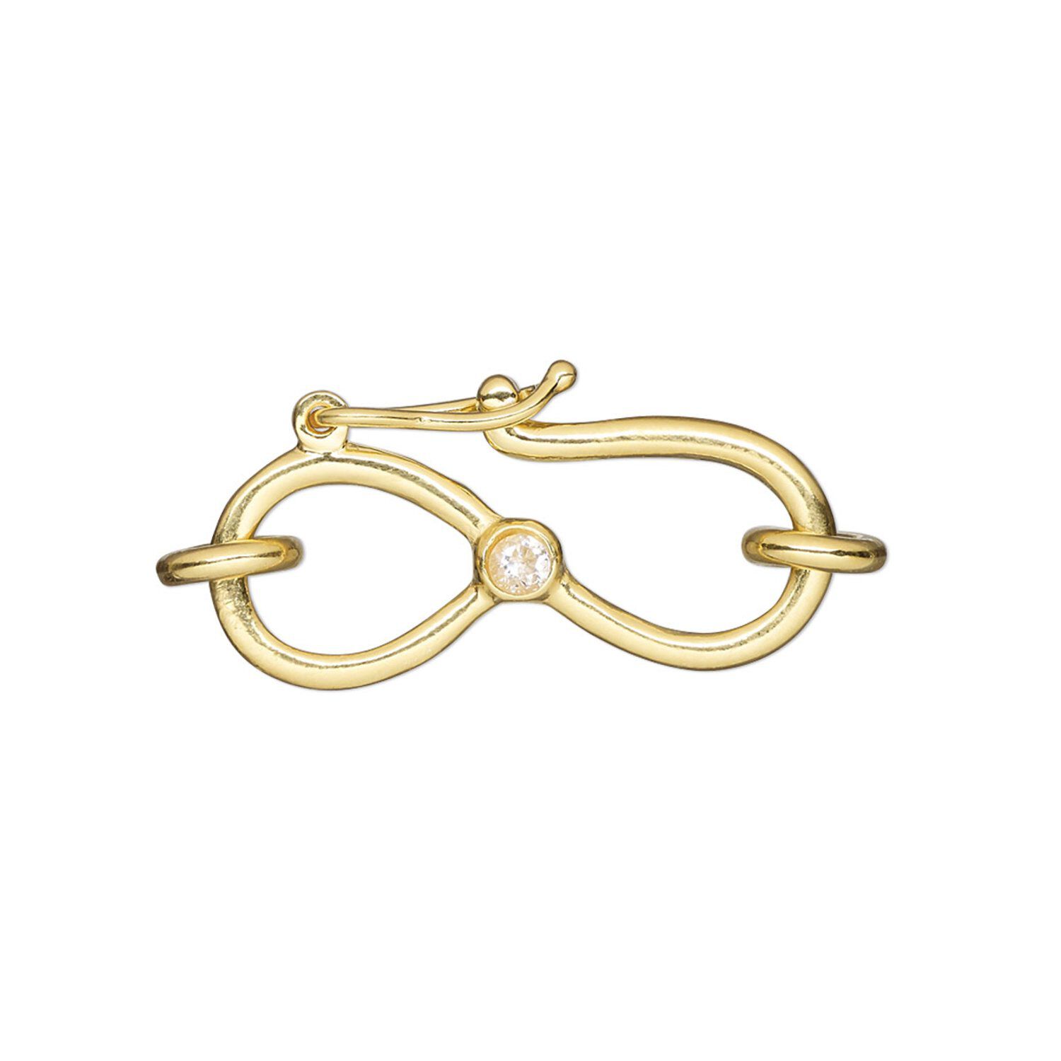 This smooth "vermeil" S-hook clasp with cubic zirconia accent features (2) 6mm closed jump rings for attaching beaded strands or chains. This clasp has an easy-to-use safety catch, to ensure that necklaces and bracelets remain closed. Sizes, shapes and colors may vary with handcrafted items. Clasp has an anti-tarnish coating.