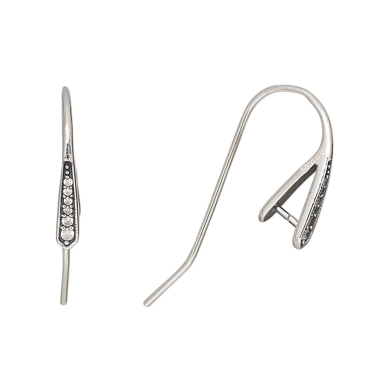 Ear wire fishhook 1pkg2 rhodium-plated sterling silver / cubic zirconia, 15mm / ice-pick bail / 5mm grip length setting, 20 gauge clear 1 pair