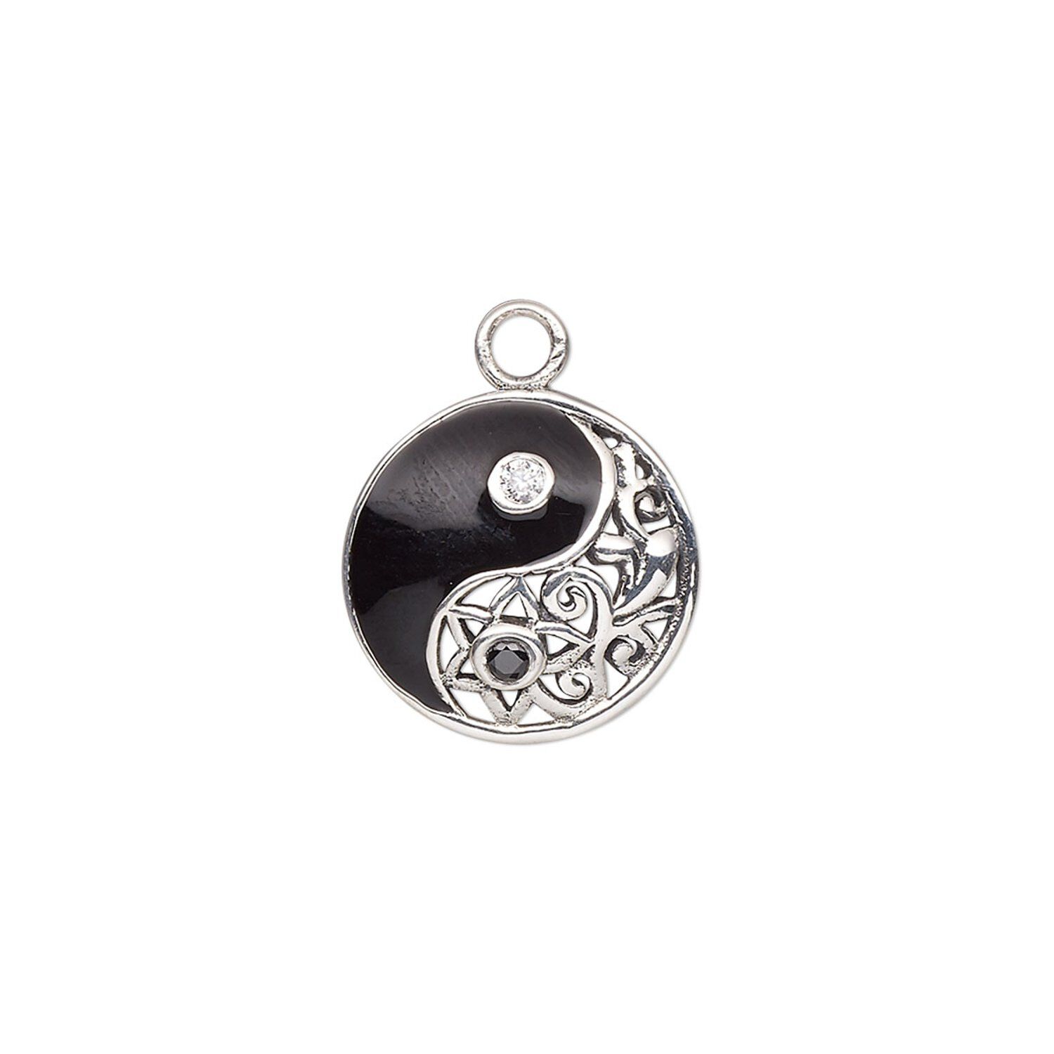 Charm, antiqued sterling silver / cubic zirconia / enamel, black and clear, 15mm single-sided domed round with yin-yang design and cutout fancy flower. Sold individually.