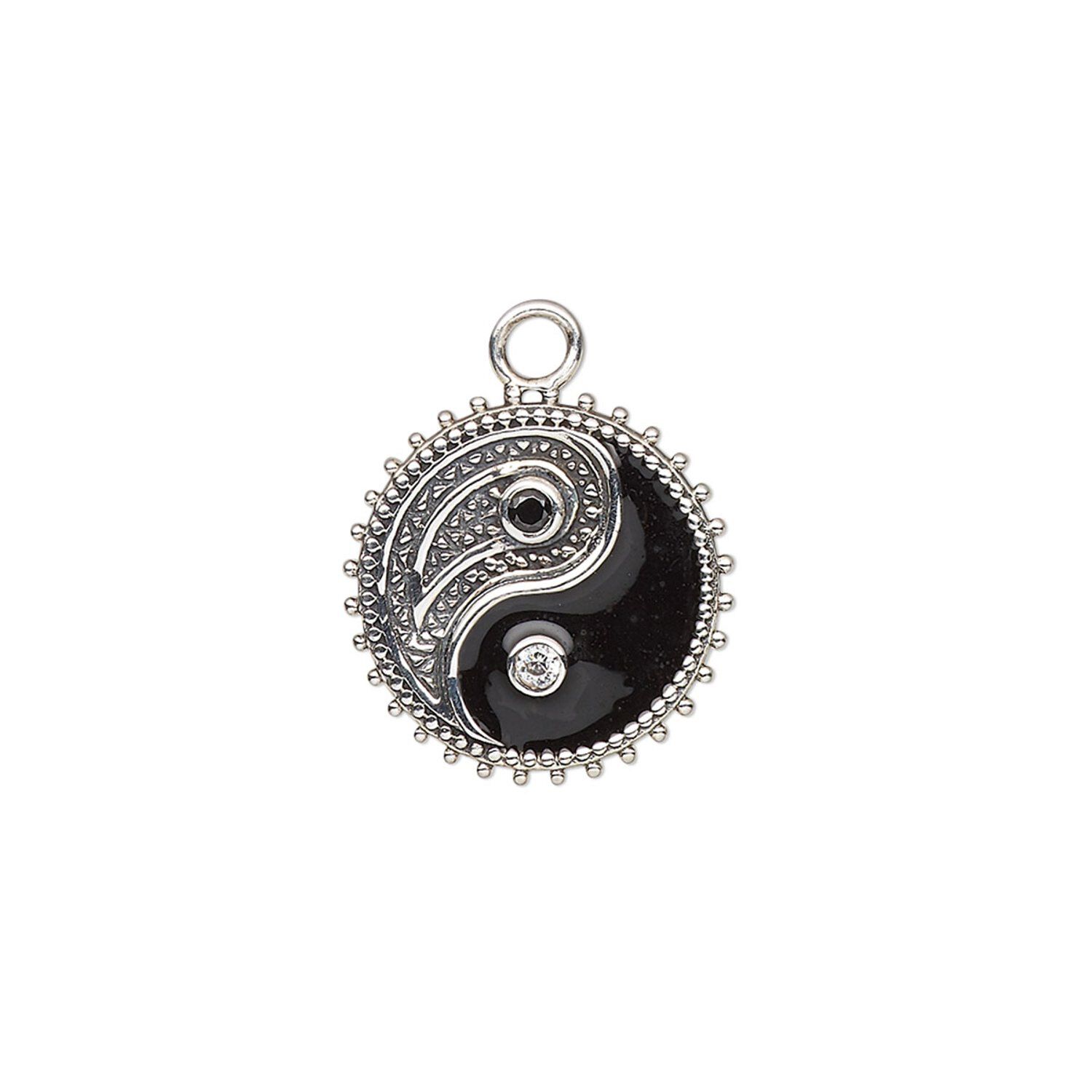Charm, antiqued sterling silver / cubic zirconia / enamel, black and clear, 16mm single-sided flat round with yin-yang and paisley designs. Sold individually.