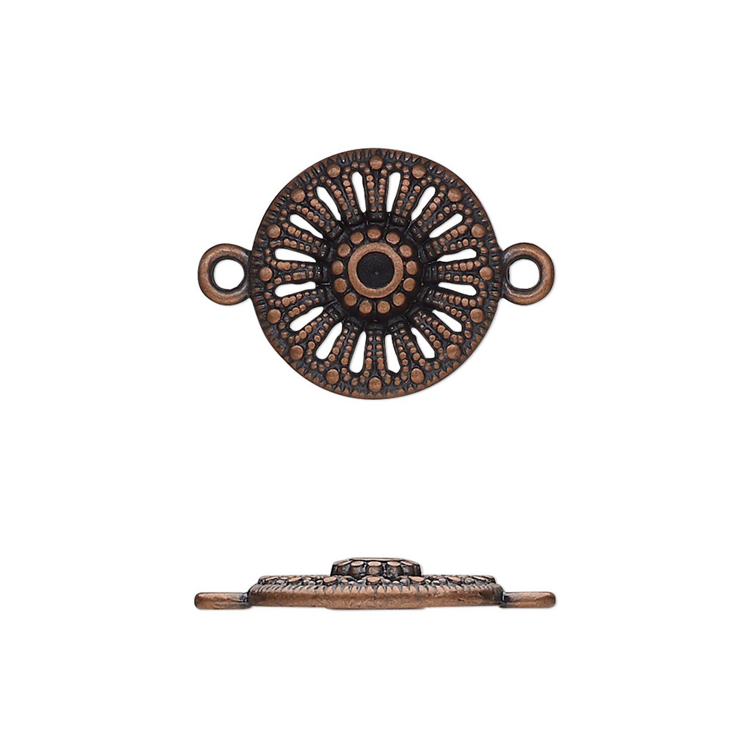 Link, antique copper-finished "pewter" (zinc-based alloy), 15mm single-sided round with cutout flower and beaded design. Sold per pkg of 20.