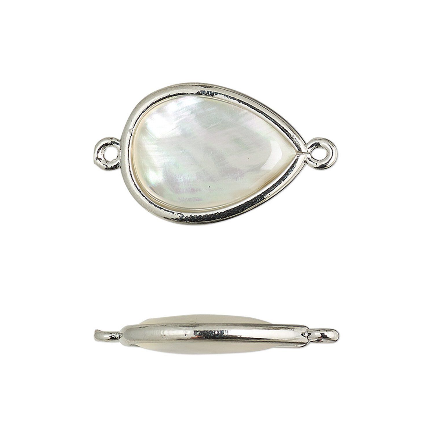 Link, mother-of-pearl shell and imitation rhodium-finished brass (assembled), 18.5x13.5mm-20x15mm double-sided teardrop. Sold per pkg of 4.