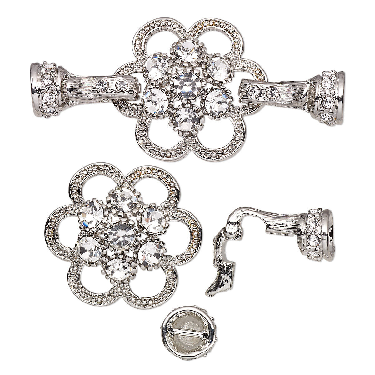 Clasp fold-over 1pkg1 silver-plated "pewter" (zinc alloy), 48x23mm flower / double latch / fits 4.7mm cord, clear rhinestone 1-strand