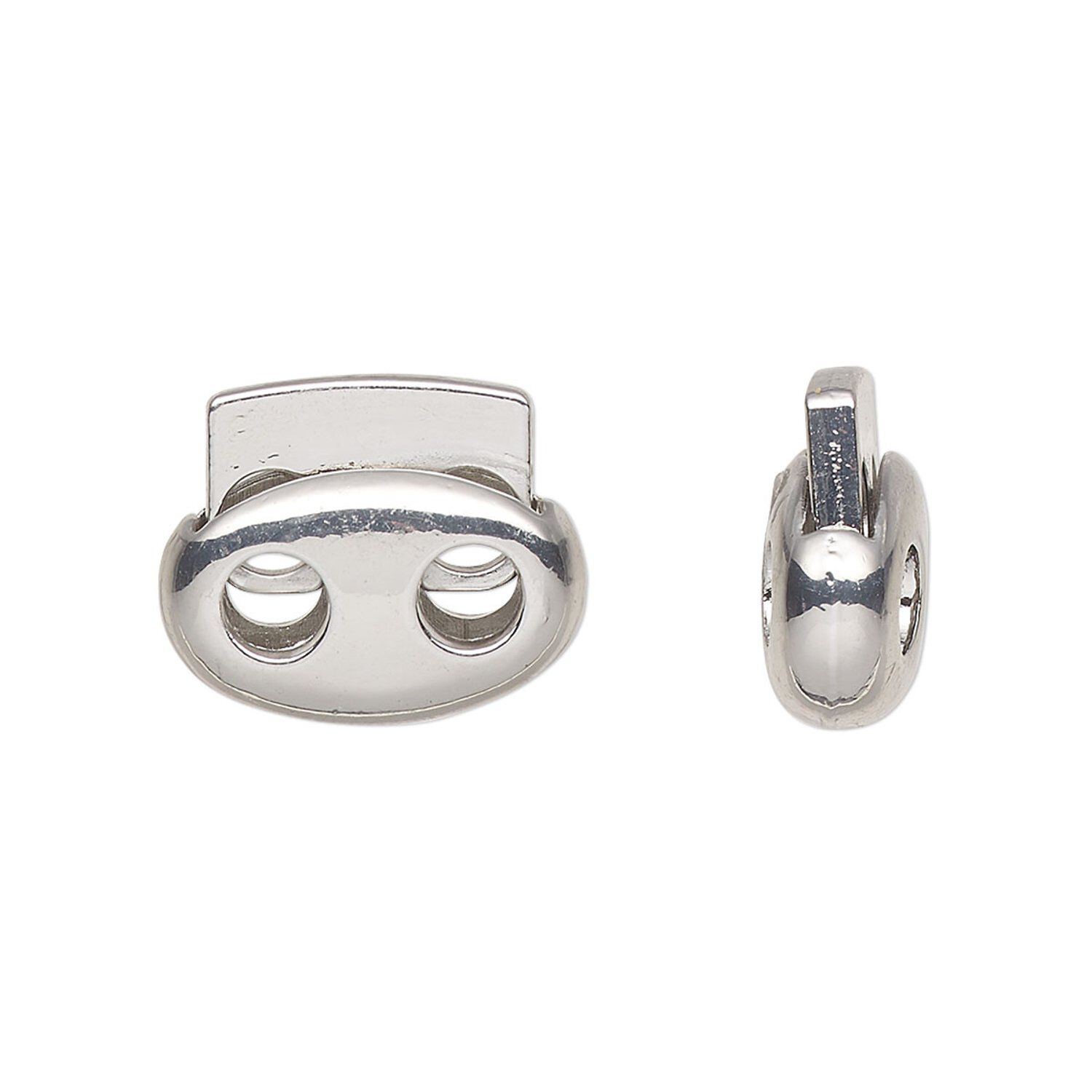 Cord lock, imitation rhodium-plated plated "pewter" (zinc-based alloy) and steel, 17x14.5mm flat oval with (2) holes. Sold per pkg of 6.