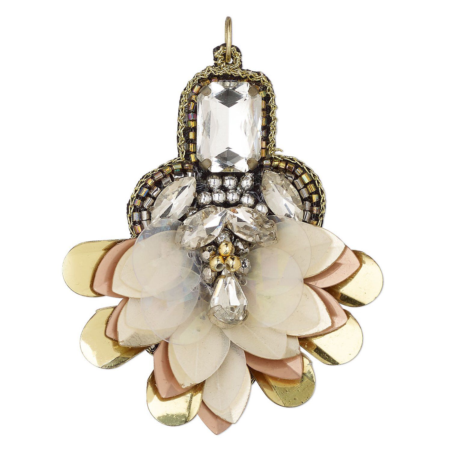 Inspired by the Indian artform Zari (or Jari) which uses metal-wrapped thread woven into fabric, these handmade focals offer intricate detail and versatility. Easily incorporate them into earrings or sew them onto clothing and handbags. Though large, their construction is light enough to be used in earrings. Like Zari, these focals feature dazzling designs made of rhinestones, glass beads and more. Sizes, shapes and colors may vary with handcrafted items.