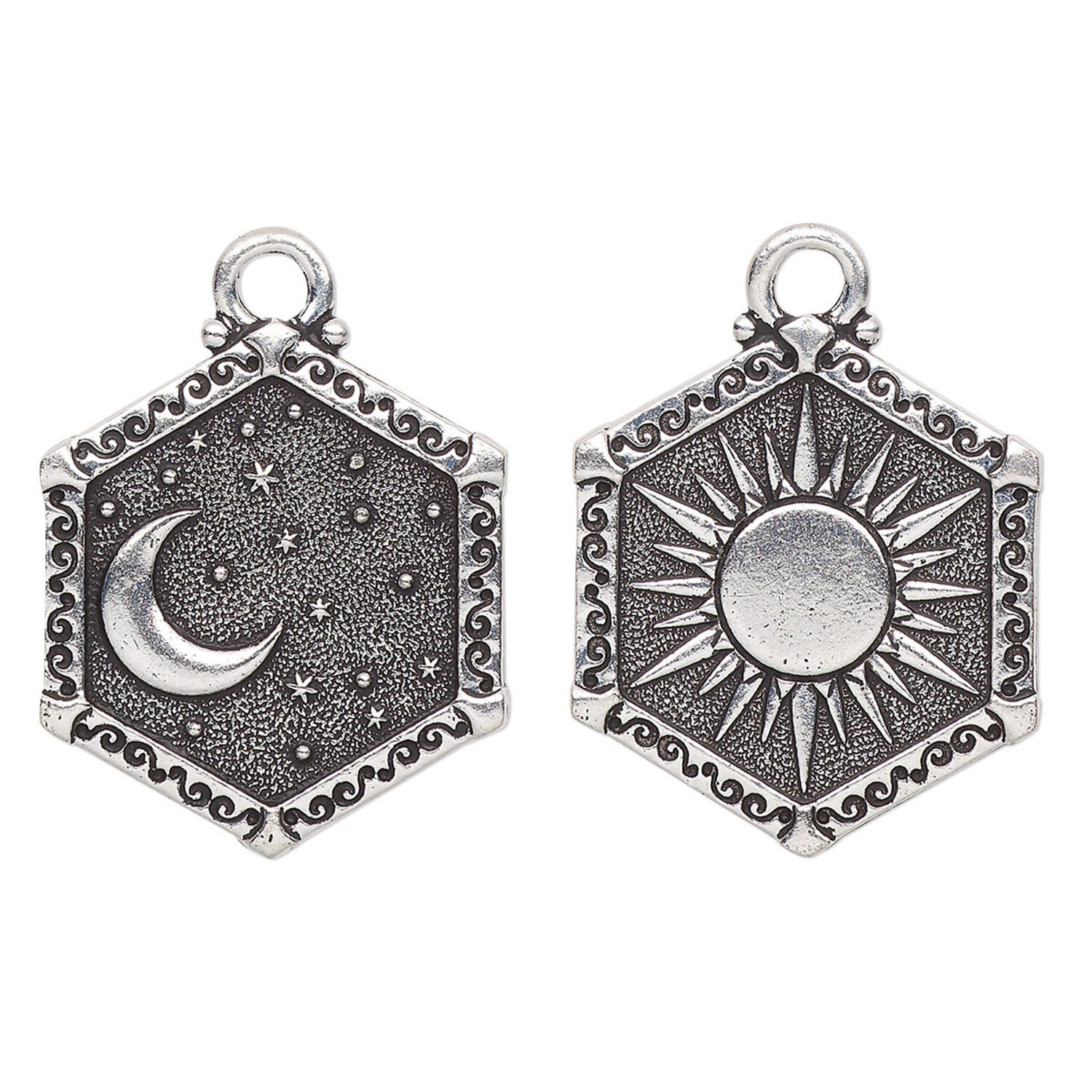 A minimalist crescent moon sits suspended in an array of stars on one side and a radial sun bursts on the other. This two-sided charm is a versatile and eye-catching addition to celestial-themed necklaces, earrings and more. A delicately detailed border accents the hexagon frame.