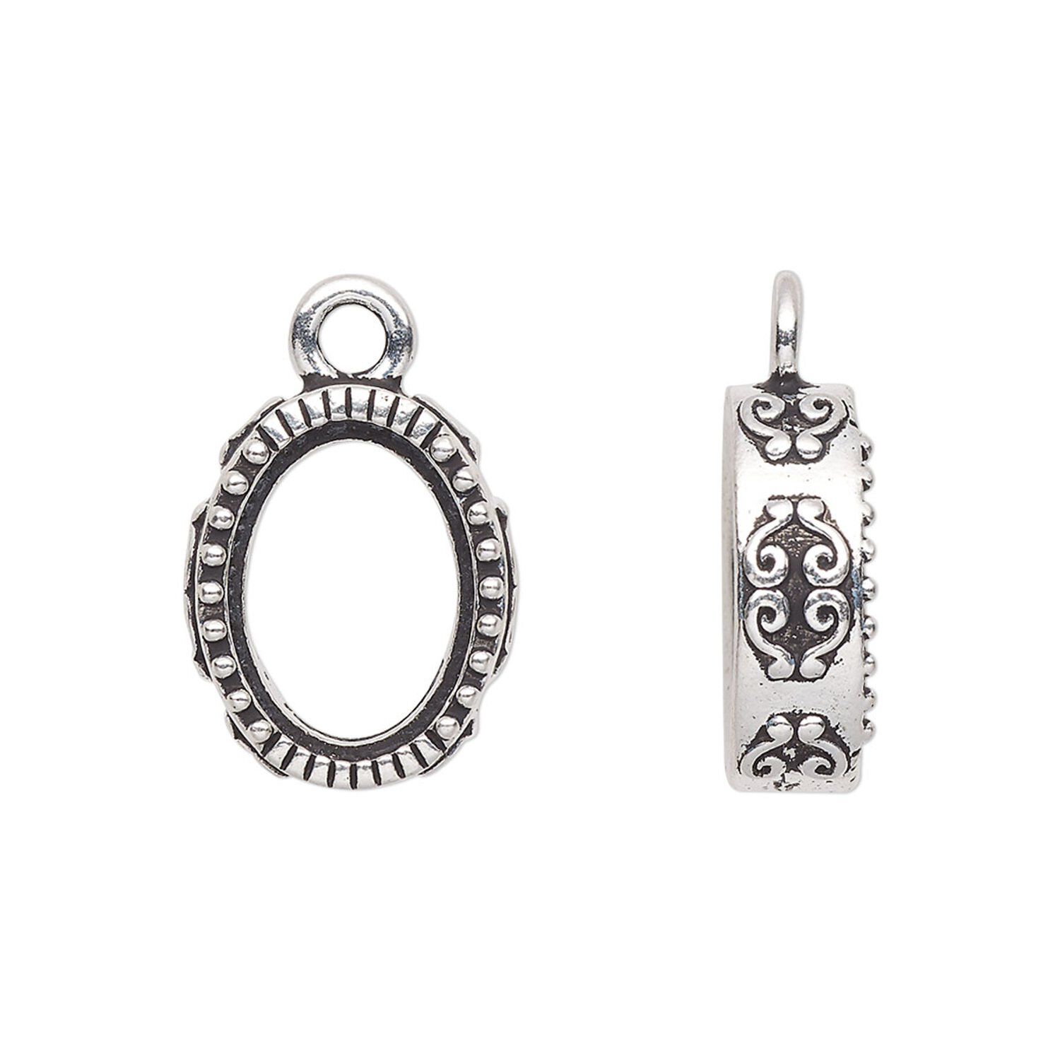 Made to fit a 14x10mm oval fancy stone or gemstone cabochon, this drop has a beautiful scroll pattern around the sides and delicate beaded embellishment on the front. Use epoxy or your favorite jewelry adhesive to secure your mounting material and easily create a stunning focal, charm or accent.