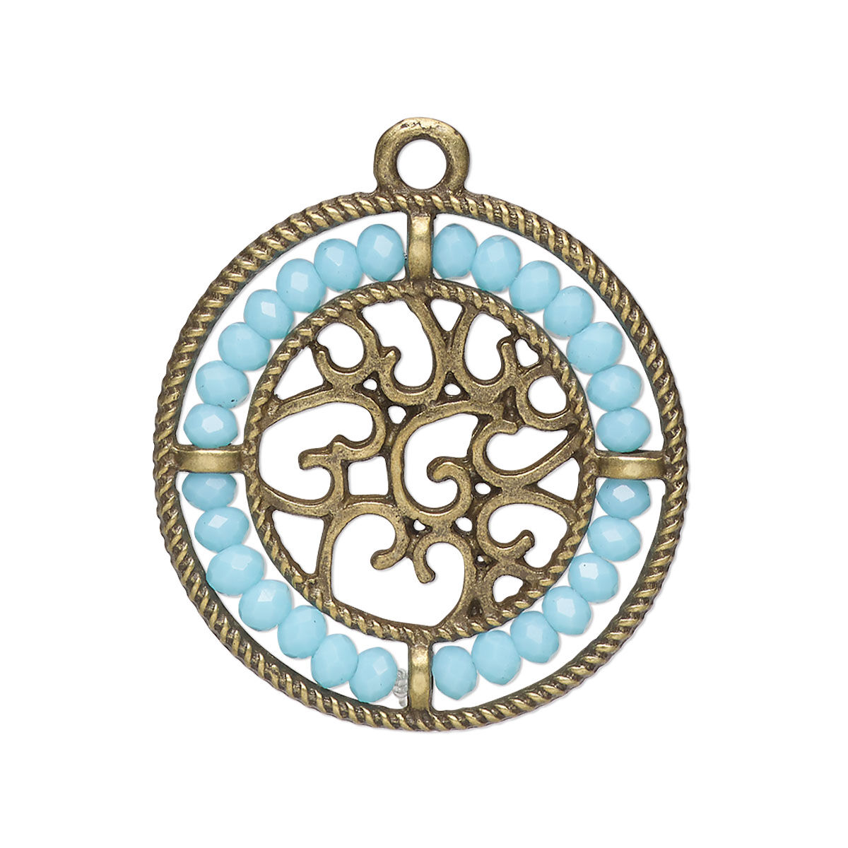 Drop, glass and antique brass-finished "pewter" (zinc-based alloy), aqua blue, 28mm round with hearts and beaded border. Sold per pkg of 2.