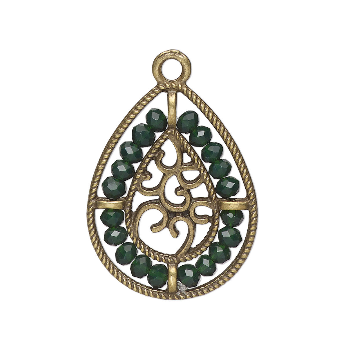 Drop, antique brass-finished "pewter" (zinc-based alloy), emerald green, 27.5 x 21.5mm teardrop with hearts and beaded border. Sold per pkg of 2.