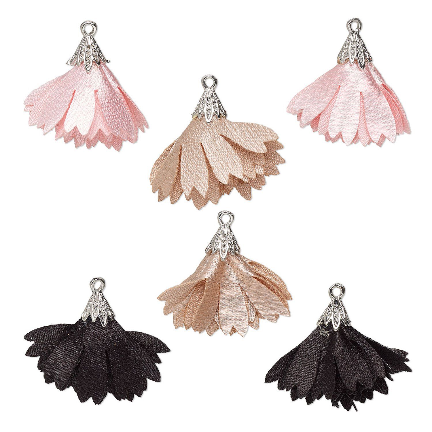 Fun and flirty! Soft fabric petals hang from imitation rhodium finish "buds," creating beautiful tassel-like blossoms. Each assortment includes two pink, two cream and two black drops. Perfect for earrings and other jewelry designs where a subtle floral touch is needed. Great for zipper pulls, too.