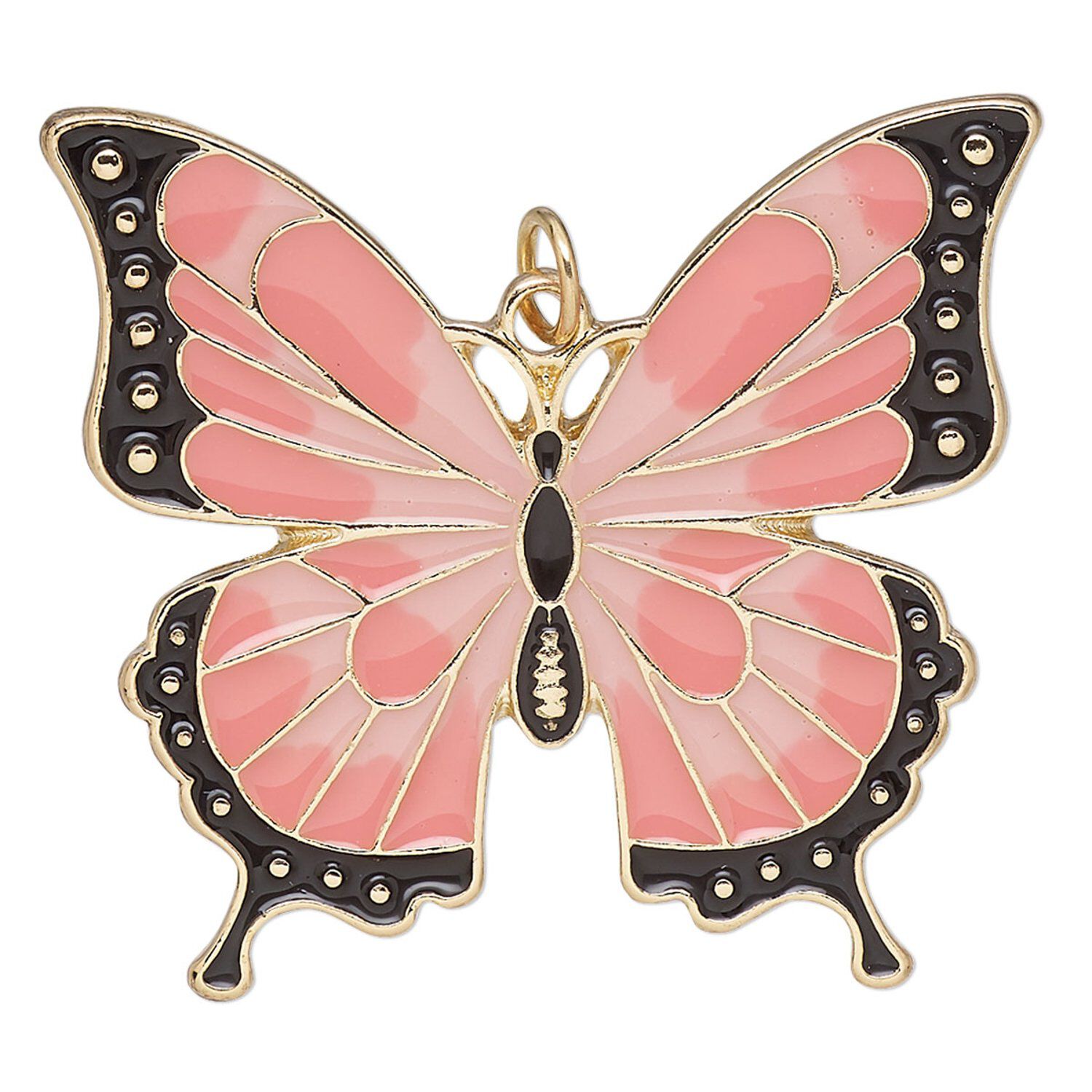 Focal, gold-finished brass and enamel, gold / pink / black, 40.5x36.5mm single-sided butterfly with jump ring. Sold individually.