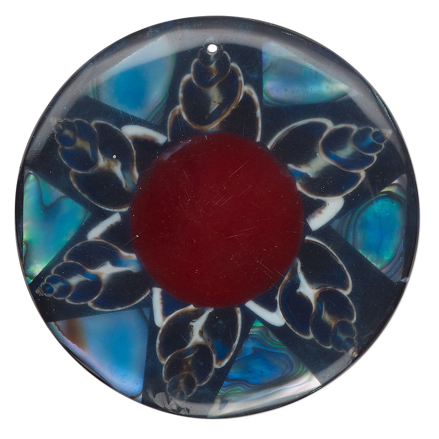 Focal, paua shell (assembled), red, 50mm top-drilled round with flower, Mohs hardness 3-1/2. Sold individually.