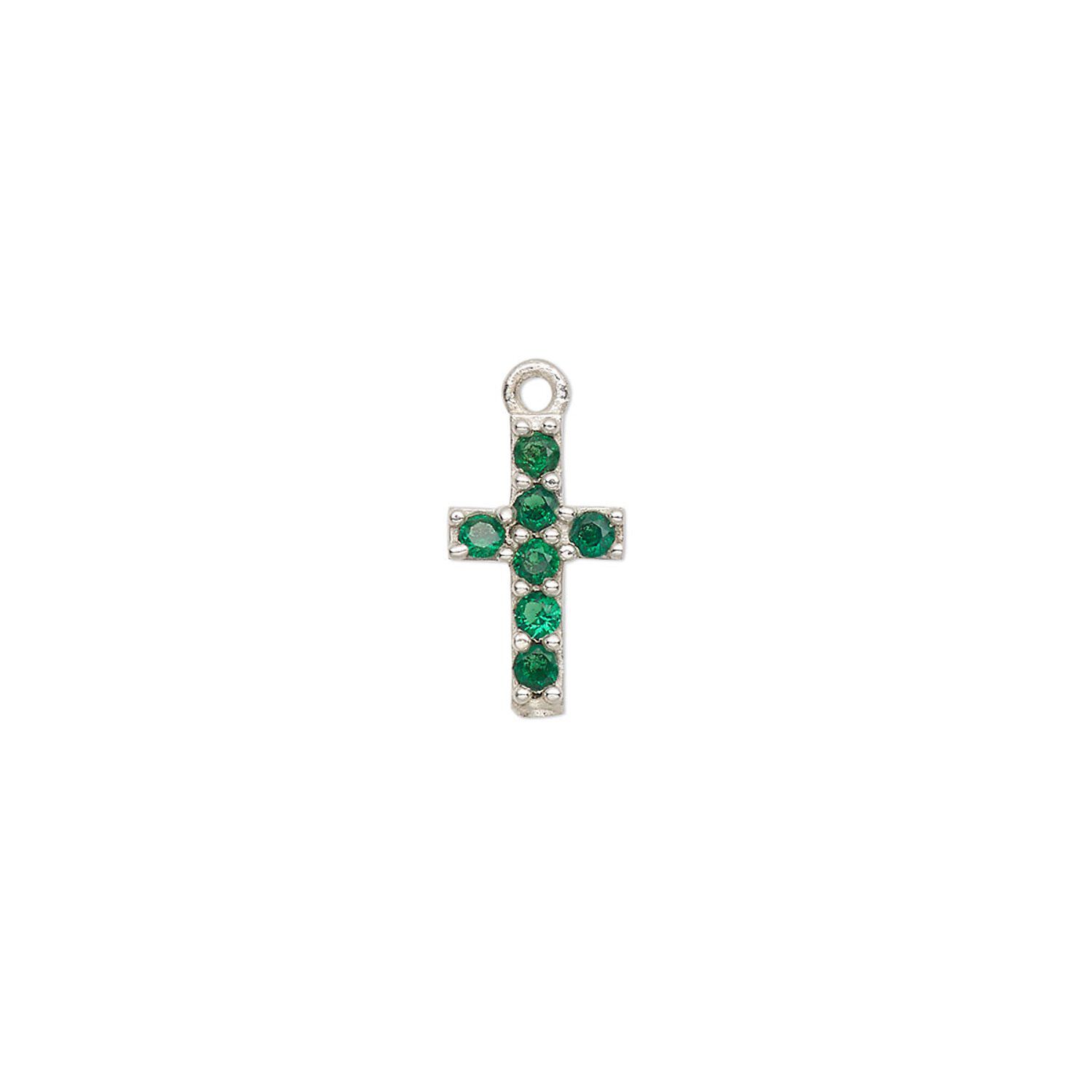 Drop, sterling silver and cubic zirconia, green, 12x7mm cross. Sold individually.