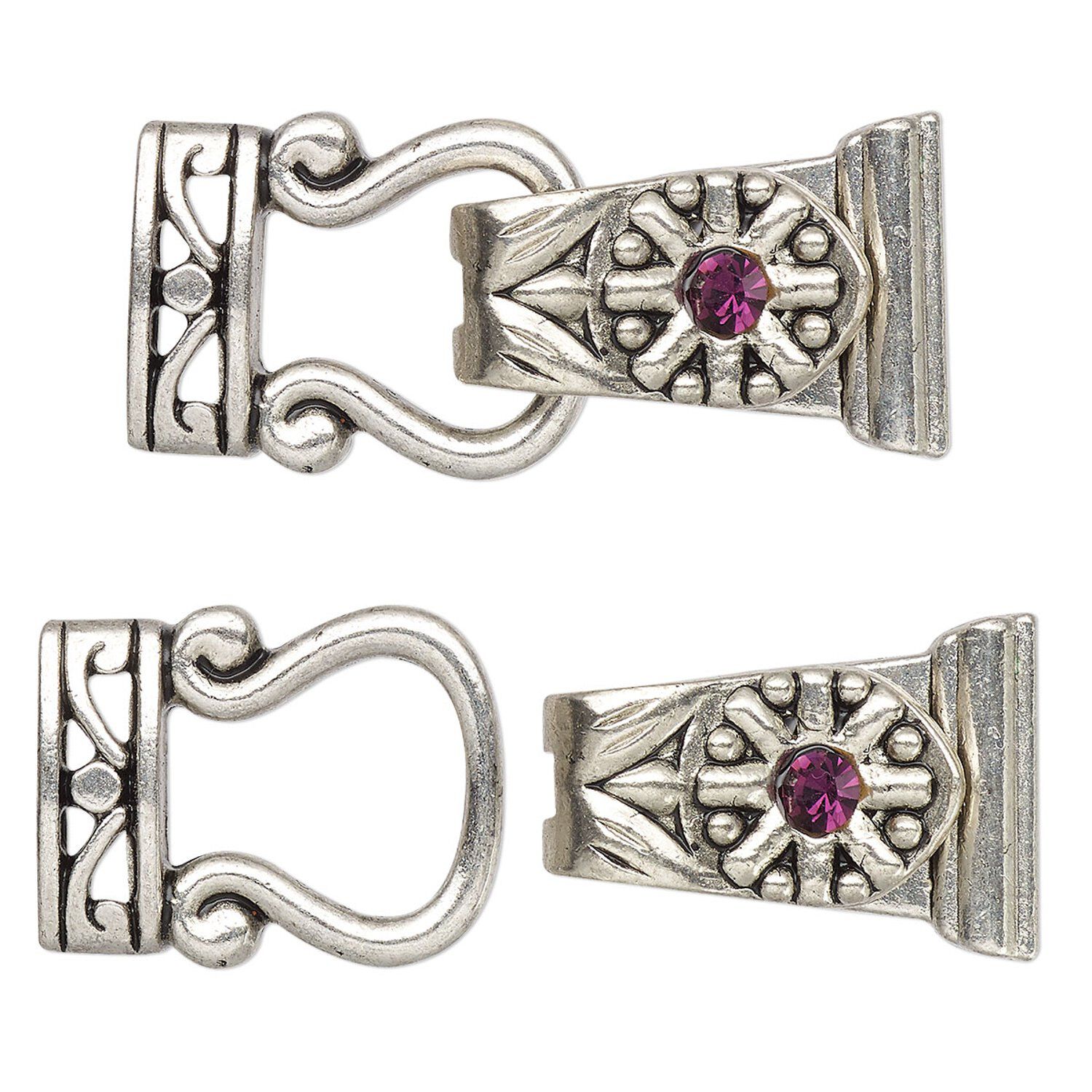 Clasp magnetic fold-over 1pkg2 "pewter" (zinc alloy), 29x13mm, antique silver-finished / purple rhinestone 2-strand