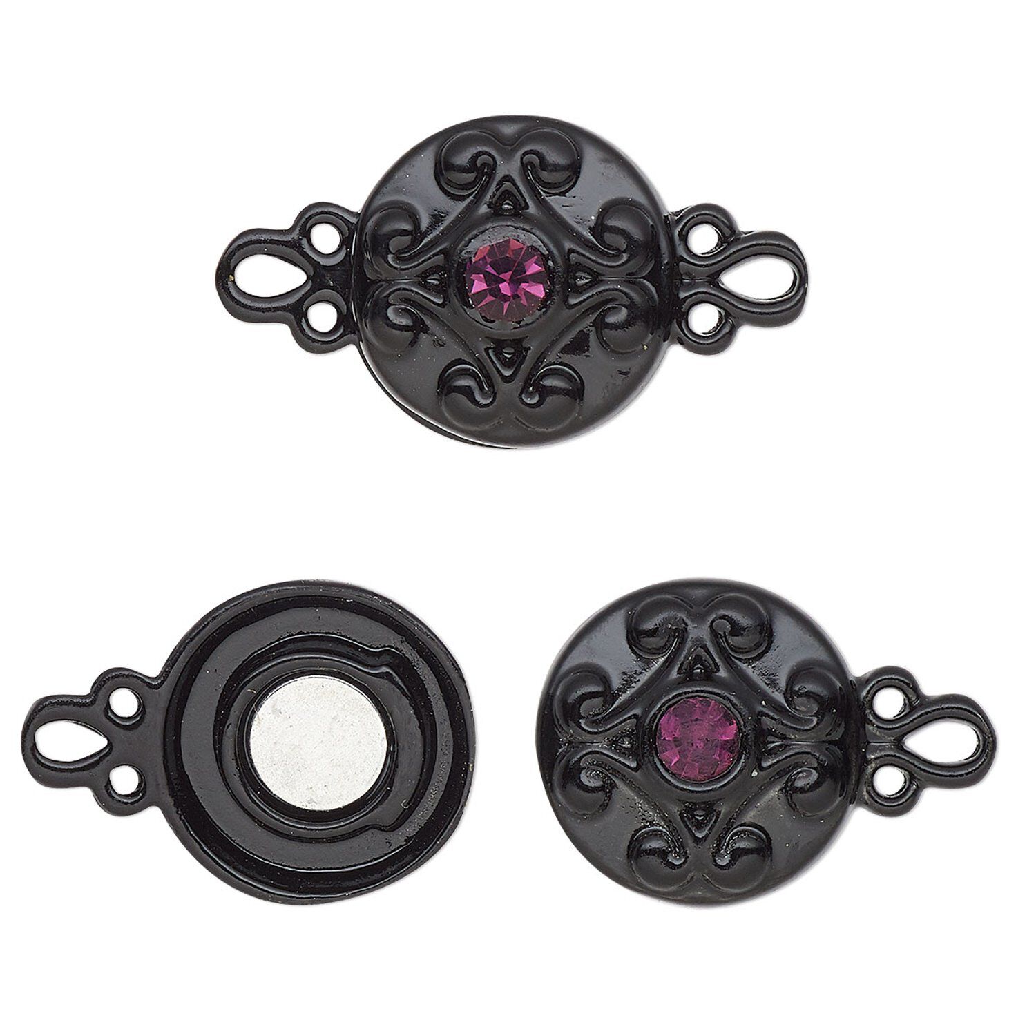 Clasp magnetic 1pkg2 "pewter" (zinc alloy), 12mm double-sided round, black-finished / purple rhinestone 1-strand