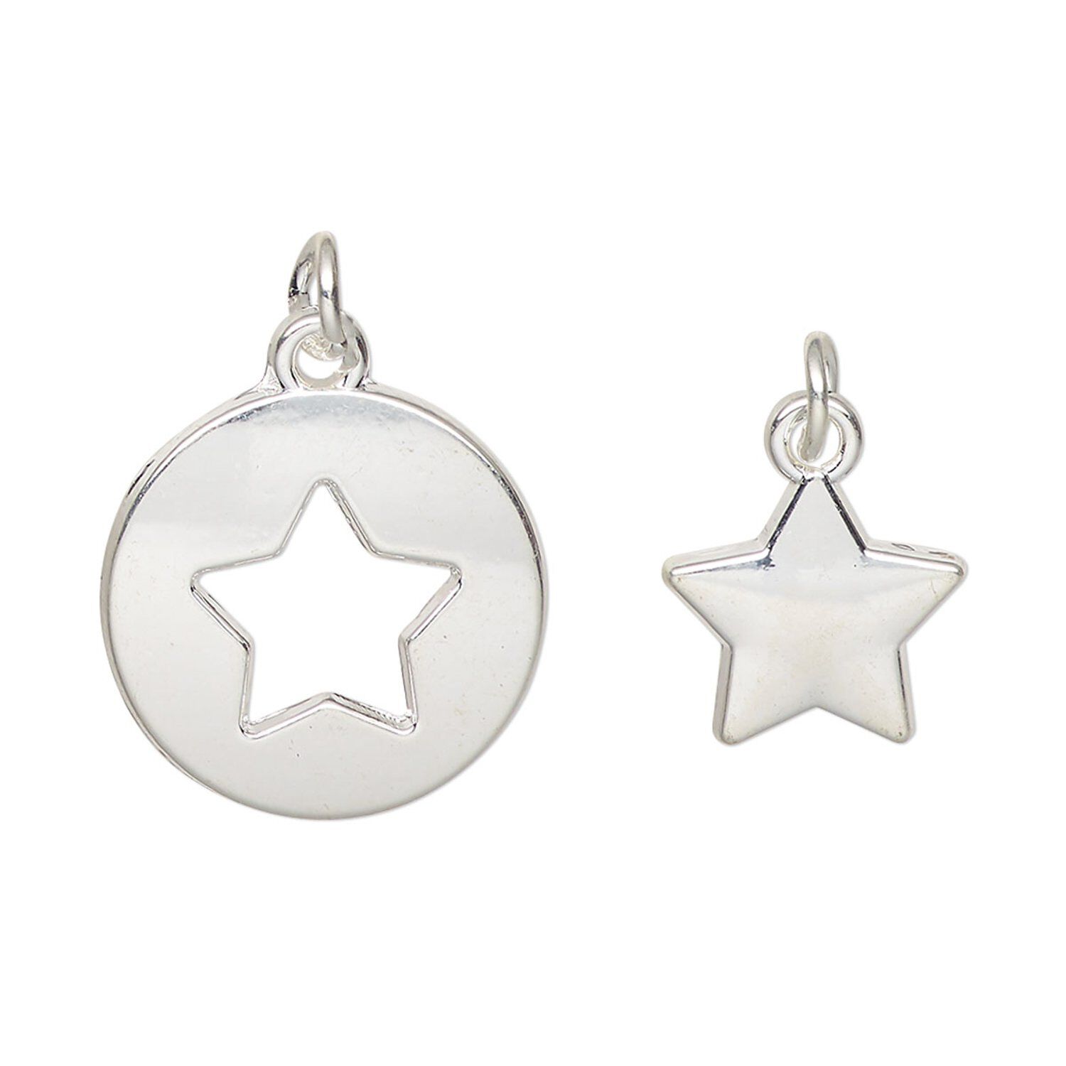 Charm, silver-finished "pewter" (zinc-based alloy) and steel, 18mm round with star cutout design and 12mm single-sided star. Sold per pkg of (2) 2-piece sets.